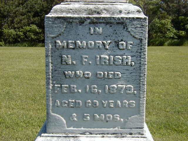 Noble Festus Irish was born in September 1809 at Haldimand Twp., Northumberland Co., Upper Canada; Date Sep 1809 per Memorial - age 69y 5m at death Feb 16 1879. Date 1811 & location USA per 1871 Census. Date 1812 & location Cda. per 1851 Census. Date 1809 & location Cda. per Death Reg'n. Date Sep 1809 & location Haldimand Twp. per GEDCOM of Jo Ann Baxley, Jan 25 2009. per GEDCOM of Edward, Jan 25, 2009.1,2,3,4,5 He married Lucia Richardson, daughter of Thomas Richardson Jr. and Ruth Sutliff, circa 1835 at Haldimand Twp., Northumberland Co., Upper Canada.1 Noble Festus Irish appeared on the census of 1852 at Haldimand Twp., Northumberland Co., Canada West; Age 39 at 1851 Census: Irish, Festus, 39, b. Cda., EM, farmer, married; Lucy, 39, b. Cda., EM, married; Austin, 16, b. Cda., EM, lab; Napoleon, 14; Wm., 11; Vanna, 2 (1851 Census: Haldimand Twp., pg. 40 of 163, line 37 - ancestry.com.)3 He lived in April 1871 at Conc 5 Lot 22, Cramahe Twp., Northumberland Co., Ontario; Residence per 1871 Census: Conc 5, Lot 22, Cramahe Twp., 100 acres, owner.2 He appeared on the census of April 1871 at Halidmand Twp., Northumberland Co., Ontario; Age 60 at 1871 Census: Irish, ? N. F., 60, b. USA, Irish, WM, farmer, married; Lucia, 56, b. USA, Irish, WM, married; William R., 30, b. Ont., Irish, WM, farmer, widower; Louis, 14, b. Ont; Sanford, 5; (1871 Census: Haldimand Twp., div. 3, pg. 49, line 10 - Conc 5, Lot 22, 100 acres, owner.)2 He died on 17 February 1879 at Haldimand Twp., Northumberland Co., Ontario, at age 69; Death Reg'n.#009775: Name: Noble Festus Irish; Date: Feb 16 1879; Age: 69 yrs; Occ.: yeoman; Born: Cda; Cause: heart disease, 3 mo; Phys.: Dr. Halliday; Inf.: W. R. Irish, yoeman, Haldimand; Reg'd.: Feb 17 1879, Rel.: Meth; Reg'r.: T. Bingley? (Ontario Death Registration, #009775-1879, ancestry.com) Date Feb 16 1879 per Memorial. Date Feb 17 1879 per GEDCOM of Jo Ann Baxley, Jan 25 2009. per GEDCOM of Edward, Jan 25, 2009.1,6,5 He was buried on 19 February 1879 at Academy Hill Cemetery, Haldimand Twp., Northumberland Co., Ontario; Memorial: (See Exhibit) In; Memory of; N. F. Irish; Who Died; feb. 16, 1879; Aged 69 Years; & 5 Mos. (Academy Hill Cemetery, Haldimand Twp., Jun 9 2007.)5
