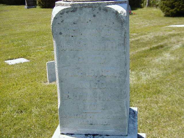 the Will of James Smith granted "the east half and south-west quarter, subject to agreements", Lot 8, Concession 3, Brighton Twp., Northumberland Co. to Herbert E. Smith. ITS Date: Mar 26 1880. Reg'n. Date: Feb 21 1881. (Ontario Land Registry Records, Northumberland Co., Brighton Twp., Conc 3, pg. 184 of 320, OnLand.ca.)7 He died on 15 February 1881 at Brighton Twp., Northumberland Co., Ontario, at age 74; Death Reg'n.#013216: Name: James Smith; Date: Feb 15 1881; Age: 74; Occ.: yeoman; Born: Ireland; Cause: inflammation of lungs, 6 days; Phyd.: Dr. Dean; Inf.: J. P. Smith, Brighton Twp; Rel.: Ep. Meth; Reg'r.: T. J. Wright (Ontario Death Registration, #013216-1881, ancestry.com.)8 He was buried on 17 February 1881 at Waite Cemetery, Cramahe Twp., Northumberland Co., Ontario; Memorial: (See Exhibit) In; Memory of; James Smith; Died ;Feb. 15, 1881; Aged; 74 Y'rs, 9 Mo's; & 7? D's; A Native of Co. Cavan; Ireland (Waite Cemetery, Cramahe Twp., July 3 2007.)6