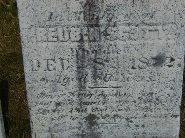 Note: This Reuben Scott and wife Sarah L. are a few lines above Reuben Scott, age 36, and his Maria A. and family. I must assume this is a father and son???1 He appeared on the census of April 1871 at Colborne, Northumberland Co., Ontario; Age 78 at 1871 Census: Scott, Ruben, 78, b. US, Eng., EM, Mechinist, widower; Jones, Jane, 52, b. Ont., Eng., EM, widow (1871 Census: Colborne, dist. 55, sub-dist. b, pg. 33, line 4 - ancestry.com)
