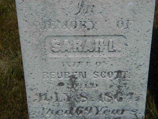 Sarah Louise Keeler was born on 22 May 1796 at Salem, Westchester Co., New York, U.S.A; Date 1795 & location USA per 1861 Census. Date 1795 & location USA per 1851 Census. Date May 22 1796 & location Salem, Westchester Co., NY per GEDCOM of Susan Barrett (tazzer416@yahoo.com) March 12 2017.1,4,3 She married Reuben Scott, son of Aaron Scott and Anne Hawley, before 1815 at Upper Canada; 1817 Census shows 1 male and one female - likely married by then. per 1861 Census.1 As of before 1815,her married name was Scott.1 Sarah Louise Keeler appeared on the census of 1852 at Cramahe Twp., Northumberland Co., Ontario; Age 56 at 1851 Census: see Reuben Scott.4 She appeared on the census of April 1861 at Cramahe Twp., Northumberland Co., Ontario; Age 66 at 1861 Census: see Rueben Scott.1 She died on 8 July 1864 at Cramahe Twp., Colborne, Northumberland Co., Ontario, at age 68; per family tree of BrownHartman on ancestry.com, Jun3 8 2011.3 She was buried on 10 July 1864 at Colborne East Cemetery, Colborne, Northumberland Co., Ontario; Memorial: (See Exhibit) In; Memory lf; Sarah L; Wife of; Reuben Scott; Died; July 8, 1864; Aged 69 Years (Colborne East Cemetery, Colborne, June 6, 2005.)5