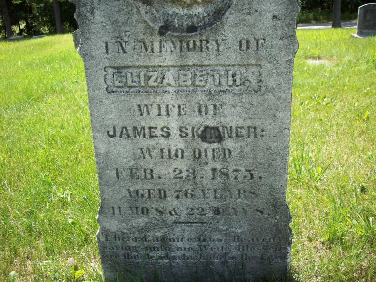Elizabeth Peyal was born on 1 March 1798 at England; Date Mar 1 1798 & location England per Memorial - age 76y 11m 22d at death Feb 23 1875. Date 1797 & location England per 1871 Census. Date 1798 & location England per 1861 Census. Date 1801 & location England per 1851 Census. per marriage reg'n. of daughter Libbie (Skinner) Snider.1,2,3,4,5 She married James Skinner before 1820; per 1851 Census. per marriage reg'n. of daughter Libbie (Skinner) Snider.1,2 As of before 1826,her married name was Skinner.1 Elizabeth Peyal appeared on the census of 1852 at Cramahe Twp., Northumberland Co., Ontario; Age 50 at 1851 Census: see James Skinner.2 She appeared on the census of April 1861 at Brighton Twp., Northumberland Co., Ontario; Age 63 at 1861 Census: see James Skinner.3 She appeared on the census of April 1871 at Brighton Twp., Northumberland Co., Ontario; Age 74 at 1871 Census: see James Skinner.4 She lived on 29 September 1871 at Brighton Twp., Northumberland Co., Ontario; Informant for Death Reg'n. of her husband James Skinner.6 She died on 23 February 1875 at Brighton Twp., Northumberland Co., Ontario, at age 76; Date Feb 23 1875 per Memorial.5 She was buried on 25 February 1875 at Castleton Cemetery, Castleton, Northumberland Co., Ontario; Memorial: (See Exhibit) In Memory ofl Elizabeth; Wife of; James Skinner; Who Died; Feb. 23, 1875; Aged 76 Years; 11 Mo's & 22 Days (Castleton Cemetery, Castleton, Jul 23 2009.)5
