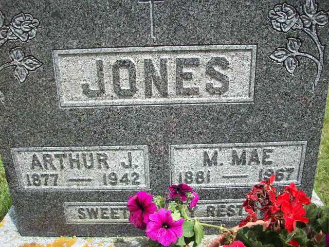 Arthur J. Jones was born on 15 April 1877 at Cramahe Twp., Northumberland Co., Ontario; Date 1877 per Memorial. Date Apr 15 1878 & location Ont. rural per 1901 Census. Date 1877 & location Ont. per 1881 Census. Date 1877 & location Cda. per marr. reg'n.1,3,4,2 He appeared on the census of April 1881 at Cramahe Twp., Northumberland Co., Ontario; Age 4 at 1881 Census: see Lemuel Jones.5 He lived on 7 November 1900 at Cramahe Twp., Northumberland Co., Ontario; Residence Cramahe Twp. per marr. reg'n.1 He married Margaret Mae "Maggie" Tackaberry, daughter of David Tackabury and Mary Eliza Towne, on 7 November 1900 at Brighton, Northumberland Co., Ontario; Marriage Reg'n.##011578: Groom: Arthur Jones; Age: 23; Res.: Cramahe Twp; Born: Cda; Status: bachelor; Occ.: farmer; Parents: Lemuel Jones & Sophronia Palmer; Bride: May Tackaberry; Age: 19; Res.: Brighton Twp; Born: Cda; Status: spinster; Parents: David Tackaberry & Mary Town; Wit.: Hattie C. Wright & Annie J. Wilson, Brighton; Date: Nov 7 1900; Place: Brighton Village; Rel.: Pres. & CE; Performed by: Rev. A. G. E. Westinscott; Reg'd.: Nov 13 1900; Reg'r.: J. Morrow (Ontario Marriage Registration, #011578-1900, ancestry.com.)6 Arthur J. Jones lived in April 1901 at Conc 2 Lot 8, Brighton Twp., Northumberland Co., Ontario; Residence per 1901 Census: Conc 2, Lot 8, Brighton Twp.3 He appeared on the census of April 1901 at Brighton Twp., Northumberland Co., Ontario; Age 23 at 1901 Census: Jones, Arthur, 23, b. Ont. r. Apr 15 1878, Irish, Meth., farm lab., married; Maggie M., 19, b. Ont. r. Jul 21 1881, Eng., Meth., married; Macklam, Irena, 60, b. Ont. r. Sep 24 1840, Eng., Pres., ?rel?, widow (1901 Census Online: Brighton Twp., dist. 95, sub-dist. a-1, pg. 6, line 37, T-6485 - Conc 2, Lot 8.)3 He died on 17 July 1942 at Colborne, Northumberland Co., Ontario, at age 65; Date 1942 per Memorial. Date Jul 17 1942 & location Colborne & "Prostate Cancer" per family tree of Dale Jones on ancestry.ca, Sep 25 2020.2,7 He was buried on 20 July 1942 at Castleton Cemetery, Castleton, Northumberland Co., Ontario; Memorial: (See Exhibit) JONES; Arthur J; 1877 - 1942; M. Mae; 1881 - 1967 (Castleton Cemetery, Castleton, JUly 15 2009, by Dan.)2