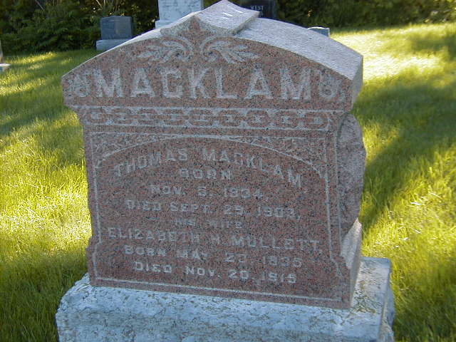 Elizabeth Hill Mullett was born on 20 May 1835 at Hallowell Twp., Prince Edward Co., Ontario; Date May 20 1835 per Memorial. Date May 1835 & location Ont. per 1911 Census. Date May 23 1835 & location Ont. rural per 1901 Census. Date 1834 & location Ont. per 1881 Census. Date 1837 & location UC per 1861 Census. Date May 23 1835 & location Hallowell Twp. per GEDCOM of Meredith, Feb 23 2010.1,2,3,4,5,6 As of 25 December 1856,her married name was Macklam.1 She married Thomas Macklam, son of Matthew Macklam and Jenett "Jane" Fleming, on 25 December 1856 at Canada West; per 1861 Census. Date Dec 25 1856 per GEDCOM of Meredith, Feb 23 2010.1,2 Elizabeth Hill Mullett appeared on the census of April 1861 at Brighton Twp., Northumberland Co., Ontario; Age 24 at 1861 Census: see Thomas Macklam.1 She appeared on the census of April 1881 at Brighton Twp., Northumberland Co., Ontario; Age 44 at 1881 Census: see Thomas Macklam.3 She appeared on the census of April 1891 at Brighton Twp., Northumberland Co., Ontario; Oddly, Elizabeth is not present in the census records for Thomas and the rest of the kids. May be a simple oversite??7 She appeared on the census of April 1901 at Brighton Twp., Northumberland Co., Ontario; Age 65 at 1901 Census: see Thomas Macklam.5 She appeared on the census of 1911 at Brighton Twp., Northumberland Co., Ontario; Age 75 at 1911 Census: see Harry Macklam (son.)6 She died on 20 November 1915 at Brighton Twp., Northumberland Co., Ontario, at age 80; Date November 20 1915 per Memorial. "Macklam, Elizabeth; Died November 20, 1915 November 26, 1915" from index of Brighton Ensign, Trenton Public Library, Dec 21 2013.