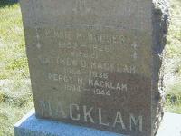 Matthew Darl Macklam was born on 12 February 1864 at Brighton Twp., Northumberland Co., Canada West; Date 1864 per Memorial. Date Feb 1863 & location Ont. per 1911 Census. Date Feb 12 1864 & location Ont. rural per 1901 Census. Date 1864 & location Ont. per 1891 Census. Date 1864 & location Ont. per 1881 Census. Date 1864 & location Brighton Twp. per marr. reg'n.1,2,4,5,6,7 He appeared on the census of April 1871 at Brighton Twp., Northumberland Co., Ontario; Age 7 at 1871 Census: see John Macklam.8 He appeared on the census of April 1881 at Brighton Twp., Northumberland Co., Ontario; Age 17 at 1881 Census: see John Macklam.1 He married Minnie Maude Hodges, daughter of Lyman Henry Hodges and Margaret J. Scott, on 19 March 1890 at Brighton Twp., Northumberland Co., Ontario; Marriage Reg'n.#008665: Groom: Matthew D. Macklam; Age: 26; Res. & Born: Brighton Twp; Status: bachelor; Occ.: farmer; Parents: John & Irena Macklam; Bride: Minnie M. Hodges; Age: 27; Res. & Born: Brighton Twp; Status: spinster; Parents: Lyman H. & Margaret Hodges; Wit.: Thomas Johnson & Gertrude Wade, Brighton Twp; Date: Mar 19 1890; Place: Brighton Twp; Rel.: Bapt. & Meth; Performed by: Rev. R. H. Leitch? (Ontario Marriage Registration, #008665-1890, ancestry.com) per Death Reg'n. of Minnie Maude Macklam.9 Matthew Darl Macklam appeared on the census of April 1891 at Brighton Twp., Northumberland Co., Ontario; Age 27 at 1891 Census: Macklam, Matthew, 27, b. Ont., p.b. Ont. & US, Meth., farmer, married; Minnie, 28, b. Ont., p.b. Ont. & Scot., Meth., married (1891 Census: Brighton Twp., Northumberland Co., (pg. 87, line 21) Ontario Archives printout (This records not coming up in ancestry.com`?)6 He lived in 1896 at Conc 3 Lot 6, Brighton Twp., Northumberland Co., Ontario; "Macklam M D, Brighton, f, Conc 3, Lot 6" Cda. Directories, 1896, Brighton Twp. - ancestry.com.10 He lived in April 1901 at Conc A Lot 6, Brighton Twp., Northumberland Co., Ontario; Residence per 1901 Census: Conc A, Lot 6, Brighton Twp.4 He appeared on the census of April 1901 at Brighton Twp., Northumberland Co., Ontario; Age 37 at 1901 Census: Macklam, Matthew, 37, b. Ont. r. Feb 12 1864, Irish, Meth., farmer, married; Minnie M., 38, b. Ont. r. Jan 20 1863, Eng., Meth., married; Percie E., 8, b. Ont. r. Feb 27 1893, Irish, Meth., son (1901 Census Online: Brighton Twp., dist. 95, sub-dist. a-1, pg. 1, line 27, T-6485 - Conc A, Lot 6.)4 He appeared on the census of 1911 at Brighton Twp., Northumberland Co., Ontario; Age 47 at 1911 Census: Macklam, Matthew, 47, b. Ont. Feb 1863, Meth., farmer, married; Minnie, 48, b. Ont. Jan 1862, Meth., married; Percy, 18, b. Ont. Feb 1893, son (1911 Census: Brighton Twp., Northumberland Co., dist. 101-1, sub-dist. 15-1, pg. 4, line 3 - Conc 3, ?SE 1/4 Lot 6 - PDF image taken from ancestry.com.)7 He lived before 30 August 1936 at Conc 2, Brighton Twp., Northumberland Co., Ontario; Residence Conc 2, Brigton Twp. per Death Reg'n.3 He died on 30 August 1936 at Belleville General Hospital, Belleville, Hastings Co., Ontario, at age 72; Death Reg'n.#018643: Name: Matthew Darl Macklam; Date: Aug 30 1936; Age: 72y 6m 18d; Place: Bellveill General Hospital, 5 wks; Res.: Conc 2, Brighton Twp; Born: Brighton Twp., Feb 12 1864; Status: widower; Nat.: Irish; Occ.: mixed farming, Mar 1936, 54 yrs; Wife: Minnie Hodges, deceased; Parents: John Macklam & Irene Johnson.b Ont; Inf.: Percy E. Macklam, 158 Margueretta St., Toronto, son; Burial: Woods Cemetery, Sep 1 1936; Und; B. E. Brintnell; Reg'd.: Sep 1 1936; Reg'r.: J. Wilfred Holmes (Ontario Death Registration, #018643-1936, ancestry.com) Date 1936 per Memorial.
