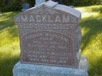 "Macklam, Thomas; Died October 2, 1903 age 69; October 9, 1903" from index of Brighton Ensign, Trenton Public Library, Dec 21 2013.3,5,12,13 He was buried on 4 October 1903 at Wood's Cemetery, Cramahe Twp., Northumberland Co., Ontario; Memorial: (See Exhibit) MACKLAM; Thomas Macklam; Born; Nov. 5, 1834; Died Sept. 29, 1903; His Wife; Elizabeth H. Mullett; Born May 20, 1835; Died Nov. 20, 1915 (Wood's Cemetery, Cramahe Twp., Jul 3 2004.)5