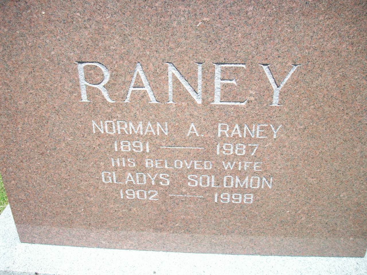 Norman Alexander Raney was born on 9 March 1891 at Kingston, Frontenac Co., Ontario; Birth Reg'n.#014047: Name: Norman Eastman Raney; Date: Mar 9 1891; Parents: William Edgar Raney & Jane Amelia Fraser; Inf.: W. E. Raney, Editor, Kingston; Reg'd.: Jun 23 1891; Phys.: Dr. R. N. Fenwick (Ontario Birth Registration, #014047-1891, ancestry.com) Date 1891 per Memorial. Datge Mar 9 1891 & location Frontenac Co. per family tree of slijou on ancestry.com, Sep 24 2012. "In 1930 my parents Gladys and Norman Raney bought a farm at the west end of town." from article called "Apples of the Past; Reminiscing about apple growing in Brighton" by Elizabeth Chatten, pg. 167 of "That's Just The Way They Were; Brighton Memories; The Municipality of Brighton" 2006.1,5,3,6 He appeared on the census of April 1891 at Kingston, Frontenac Co., Ontario; Age 1 month at 1891 Census: see William E. Raney.7 He appeared on the census of April 1901 at Toronto Junction, York Co., Ontario; Age 10 at 1901 Census: see William E. Raney.8 He appeared on the census of 1911 at Etobicoke, York Centre, Ontario; Age 23 at 1911 Census: Raney, Norman, 23, b. Ont. Mar 1891, French, Pres., farmer, boarder, single (1911 Census: Etobicoke, York Centre, dist. 136, sub-dist. 1-7, pg. 7, line 16 - ancestry.com.)9 He appeared on the census of 1921 at Ward 4, Toronto North, York Co., Ontario; Age 30 at 1921 Census: see William Raney.10 He lived on 23 August 1925 at Toronto, York Co., Ontario; Border Crossing Manifest: Name: Norman Eastman Raney; Age: 35; Status: married; Occ.: Dairy Inspector; Born: Kingston, Ont; Res.: Toronto, Ont; Nat.: Dutch; Destination: Cleveland, Ohio, (friend) Ralph Rerser?, 1539 Rosswood Ave., Cleveland; Kin: Father, Wm. Edgar Raney, 3 Nina Ave., Toronto; Date: Aug 23 1925 (ancestry.com.)11 He "In 1930 my parents Gladys and Norman Raney bought a farm at the west end of town." from article called "Apples of the Past; Reminiscing about apple growing in Brighton" by Elizabeth Chatten, pg. 167 of "That's Just The Way They Were; Brighton Memories; The Municipality of Brighton" 2006. in 1930 at Brighton Twp., Northumberland Co., Ontario.1 He lived on 2 April 1930 at Brighton, Northumberland Co., Ontario; Residence Brighton per marr. reg'n. - Gladys Irene Solomon.12 He married Gladys Irene Solomon, daughter of George Drewry Solomon and Lizzie Winterborn, on 2 April 1930 at Toronto, York Co., Ontario; Marriage Reg'n.#002710: Groom: Norman Alexander Raney; Age: 39; Res.: Brighton; Born: Ont; Status: bachelor; Occ.: farmer; Rel.: United; Parents: Wm. Edgar Raney & Jessie A. Fraser; Bride: Gladys Irene Solomon; Age: 28; Res.: 388 Brunswick Ave., Toronto; Born: Ont; Status: spinster; Rel.: United; Parents: George Drewry Solomon & Lizzie Winterborn; Expected Res.: Toronto; Wit.: James A. Orr, Long Branch, Ont. & Adelaide E. Solomon, Toronto; Date: Apr 2 1930; Place: Toronto; Performed by: Geo. C. Pidgeon, 470 Huron St., Toronto, United Church of Canada; Sworn: Toronto, March 24 1930; Reg'r.: W. G. Gates, Toronto (Ontario Marriage Registration, #002710-1930, ancestry.ca) Border Crossing Manifest in 1925 says he is married. Note: I am guessing that Gladys Irene Solomon (b. 1902) daughter of George Solomon, is the same Gladys who married Norman Raney. Elizabeth Raney, their daughter, called George Solomon her grandfather - from article called "Apples of the Past; Reminiscing about apple growing in Brighton" by Elizabeth Chatten, pg. 167 of "That's Just The Way They Were; Brighton Memories; The Municipality of Brighton" 2006.1,11,13 Norman Alexander Raney lived in 1940 at Brighton, Northumberland Co., Ontario; "140 Ranye, Norman, farmer, Brighton" from Canada Voters List, 1940, Northumberland Co., Polling Div. No. 20 - Brighton Village (ancestry.com.)11 He lived in 1965 at 385 Main St., Brighton, Northumberland Co., Ontario; "186 Raney, Norman A., farmer, 385 Main St., Brighton; 184 Raney, Mrs. Gladys, Homemaker, 385 Main St., Brighton" from Canada Voters List, 1965, Brighton Village (ancestry.com.)11 He died on 4 March 1987 at Ontario at age 95; Date 1987 per Memorial. Date Mar 4 1987 per family tree of stijou on ancestry.com, Sep 24 2012.5,3 He was buried on 7 March 1987 at Mount Hope Cemetery, Brighton, Northumberland Co., Ontario; Memorial: (See Exhibit) RANEY; Norman A. Raney; 1891 - 1987; His Beloved Wife; Gladys Solomon; 1902; 1998 (Mount Hope Cemetery, Brighton, June 5, 2009.)5