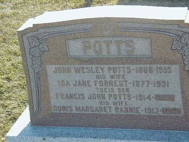 "Frank was born on April 5 1914 at Concession 1, Lot 7, Seymour Township, to John Wesley Potts (1868-1955) and Ida May Forrest (1877-1951). Frank had four sisters. His great grandfather, George Potts, came to Canada from Kent County, England in 1837 with his wifef Rebecca, and settled on the top of the sand hill know as Potts Island in the Percy Reach/Bradley Bay area of the Trent."1,5 John Wesley Potts died in 1955 at Campbellford Memorial Hospital, Campbellford, Northumberland Co., Ontario; Date 1955 per Memorial. Date 1955 per pg. 462, "Gleanings: History of Campbellford & Seymour Township".1,3 He was buried in 1955 at English Line Cemetery, Seymour Twp., Northumberland Co., Ontario; Memorial: (See Exhibit) POTTS; John Wesley Potts 1868-1955; His Wife; Ida Jane Forrest 1877-1951; Their Son; Francis John Potts 1914- ; His Wife; Doris Margaret Rannie 1913- (English Line Cemetery, Seymour Twp., Aug 11 2006, by Dan - newer pic required.)3