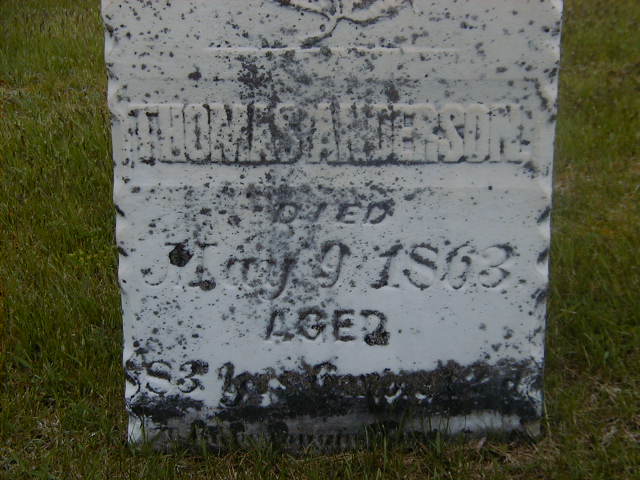 Note: This one includes a Thomas Anderson, Jr., just him alone, a few lines down from the other Andersons - son of Thomas??? He appeared on the census of 1826 at Conc 9 Lot 9, Murray Twp., Northumberland Co., Upper Canada; 1826 Census: Thomas Anderson; 160 acres uncult; 40 acres cult; Lot 9, Conc 9; 1 male over 16; 6 males under 16; 1 female over 16; Total 8. He appeared on the census of 1827 at Conc 9 Lot 9 Murray Twp., Northumberland Co., Upper Canada; 1827 Assessment: Thomas Anderson; Lot 9, Conc 9, 150 acres uncult; 50 acres cult. and 100 acres uncult., 0 acres cult., NW ? Lot 8, Conc 3. He appeared on the census of 1827 at Murray Twp., Northumberland Co., Upper Canada; 1827 Census: Thomas Anderson; 1 male over 16; 1 female over 16; 6 males under 16. He appeared on the census of 1828 at Conc 9 Lot 9, Murray Twp., Northumberland Co., Ontario; 1828 Census: Thomas Anderson; 145 azcres uncult; 55 acres cult; Lot 9; Conc 9; also 100 acres uncult; 0 acres cult; Lot 3; Conc 8; 4 males over 16; 5 males under 16; 1 female over 16; Total 10. He appeared on the census of 1829 at Conc 9 Lot 9, Murray Twp., Northumberland Co., Upper Canada; 1829 Assessment: Thomas Anderson; Lot 9, Conc 9, 150 acres uncult; 50 acres cult. and 100 acres uncult., 0 acres cult., ? Lot 8, Conc 3; 3 males over 16; 5 females over 16; 1 male under 16; Total 9. He appeared on the census of 1830 at Conc 9 Lot 9, Murray Twp., Northumberland Co., Ontario; 1830 Census: Thomas Anderson; 140 acres uncult; 60 acres cult; Lot 9; Conc 9; also 100 acres uncult; 0 acres cult; W 1/2 Lot 3; Conc 8; 3 males over 16; 1 female over 16; 5 males under 16; Total 9. He appeared on the census of 1831 at Conc 9 Lot 9, Murray Twp., Northumberland Co., Upper Canada; 1831 Assessment: Thomas Anderson; Lot 9, Conc 9, 140 acres uncult; 60 acres cult. and 100 acres uncult., 0 acres cult., pt. Lot 3, Conc 8; 2 males over 16; 5 males under 16; 1 female over 16; Total 8. He appeared on the census of 1832 at Conc 9 Lot 9, Murray Twp., Northumberland Co., Upper Canada; 1832 Assessment: Thomas Anderson; Lot 9, Conc 9, 130 acres uncult; 70 acres cult. and 42 acres uncult., ? acres cult., NW pt. Lot 3, Conc 9; 4 males over 16; 5 males under 16; 1 female over 16; Total 10. He appeared on the census of 1833 at Conc 9 Lot 9, Murray Twp., Northumberland Co., Upper Canada; 1833 Assessment: Thomas Anderson; Lot 9, Conc 9, 140 acres uncult; 60 acres cult. 2 males over 16; 5 males under 16; 1 female over 16; Total 8. He appeared on the census of 1834 at Conc 9 Lot 9, Murray Twp., Northumberland Co., Upper Canada; 1834 Assessment: Thomas Anderson; Lot 9, Conc 9, 120 acres uncult; 80 acres cult. 1 male over 16; 6 males under 16; 2 females over 16; Total 10. He appeared on the census of 1835 at Conc 9 Lot 9, Murray Twp., Northumberland Co., Upper Canada; 1835 Assessment: Thomas Anderson; Lot 9, Conc 9, 120 acres uncult; 80 acres cult; 4 males over 16; 6 males under 16; 1 female over 16. He appeared on the census of 1836 at Conc 9 Lot 9, Murray Twp., Northumberland Co., Upper Canada; 1836 Assessment: Thomas Anderson; Lot 9, Conc 9, 120 acres uncult; 80 acres cult; 4 males over 16; 6 males under 16; 1 female over 16; Total 11. He appeared on the census of 1837 at Conc 9 Lot 9, Murray Twp., Northumberland Co., Upper Canada; 1837 Census: Thomas Anderson; 120 acres uncult; 80 acres cult; Lot 9; Conc 9; 2 males over 16; 5 males under 16; 1 female over 16; 1 female under 16; Total 9. He appeared on the census of 1837 at Conc 9 Lot 9, Murray Twp., Northumberland Co., Upper Canada; 1837 Assessment: Thomas Anderson; Lot 9, Conc 9, 120 acres uncult; 80 acres cult; 2 males over 16; 5 males under 16; 1 female over 16; 1 female under 16; Total 9. He appeared on the census of 1838 at Conc 9 Lot 9, Murray Twp., Northumberland Co., Upper Canada; 1838 Assessment: Thomas Anderson; Lot 9, Conc 9, 150 acres uncult; 50 acres cult; 2 males over 16; 6 males under 16; 1 female over 16; 1 female under 16; Total 10. He appeared on the census of 1839 at Murray Twp., Northumberland Co., Upper Canada; 1839 Census: Thomas Anderson; 2 males over 16; 3 males under 16; 1 female over 16; 1 female under 16. He appeared on the census of 1839 at Conc 9 Lot 9, Murray Twp., Northumberland Co., Upper Canada; 1839 Assessment: Thomas Anderson; Lot 9, Conc 9, 130 acres uncult; 70 acres cult. He appeared on the census of 1840 at Murray Twp., Northumberland Co., Upper Canada; 1840 Census: Thomas Anderson; 5 males under 16; 3 males over 16; - female over 16; 1 female under 16. He appeared on the census of 1841 at Murray Twp., Northumberland Co., Canada West; 1841 Census: Thomas Anderson; 3 males over 16; 4 males under 16; 1 female over 16. He appeared on the census of 1848 at Conc 9 Lot 9, Murray Twp., Northumberland Co., Canada West; 1848 Census: Thomas Anderson; Conc 9, Lot 9, prop; farmer. He appeared on the census of 1850 at Conc 9 Lot 9, Murray Twp., Northumberland Co., Canada West; 1850 Census: Thomas Anderson; Conc 9, Lot 9, prop; 4 persons. He appeared on the census of 1852 at Murray Twp., Northumberland Co., Canada West; Age 70 at 1851 Census: Anderson, Thomas, 70, b. Cda., WM, farmer, widower; Charles, 25, b. Cda., WM, lab., married; Nancy, 23, b. Cda., WM, married; Ferguson, Margaret, 22, b. Cda., single; Jacob, 21, b. Cda., WM, lab., single; Sarah Jane, 1 (1851 Census Online: Murray Twp., pg. 106 of 172, line 30.)2 He appeared on the census of April 1861 at Murray Twp., Northumberland Co., Canada West; Age 80 at 1861 Census: see Charles Anderson (son.)4 He died on 9 May 1863 at Murray Twp., Northumberland Co., Canada West, at age 83; Date May 9 1863 per Memorial. Date May 4 1893 ("Possibly died Feb 16 1875 .. ) per GEDCOM of Robert Graham, June 26, 2009.1,5 He was buried on 11 May 1863 at Stockdale Cemetery, Stockdale, Northumberland Co., Canada West; Memorial: (See Exhibit) Thomas Anderson; Died; May 9, 1863; Aged; 83 Yrs .... (Stockdale Cemetery, Stockdale, May 26 2006.)5
