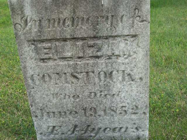 Eliza Cox was born in 1808 at Tralley, Berkshire, England; Date 1808 per CemSearch. Location England per 1891 Census. per Death Reg'n. of son John Comstock. Date 1807 & location Tralley, Berkshire, England per family tree of teenamara on ancestry.ca, Aug 22 2022.1,3,4,2 She married Elijah Comstock on 7 April 1830 at Colborne, Northumberland Co., Upper Canada; per Death Reg'n. of son John Comstock. Date Apr 7 1830 & location Colborne per family tree of teenamara on ancestry.ca, Aug 22 2022.1,2 As of 7 April 1830,her married name was Comstock.1 Eliza Cox died on 19 June 1852 at Cramahe Twp., Northumberland Co., Canada West; Date Jun 19 1852 per Memorial. Date June 19 1852 per family tree of teenamara on ancestry.ca, Aug 22 2022.4,2 She was buried on 21 June 1852 at Salem Cemetery, Cramahe Twp., Salem, Northumberland Co., Canada West; Memorial: (see Exhibit) In Memory of; ELIZA; COMSTOCK; Who Died; June 19, 1852; AE. 44 Years (Salem Cemetery, Cramahe Twp., July 6 2009, by Dan Buchanan.)4