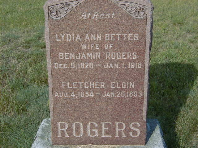 Fletcher Elgin Rogers was born on 4 August 1854 at Murray Twp., Northumberland Co., Canada West; Date Aug 4 1854 per Memorial. Date 1855 & location Ont. per 1871 Census. Date 1854 & location UC per 1861 Census.1,2,3 He appeared on the census of April 1861 at Murray Twp., Northumberland Co., Canada West; Age 7 at 1861 Census: see Benjamin Rogers.1 He appeared on the census of April 1871 at Murray Twp., Northumberland Co., Ontario; Age 16 at 1871 Census: see Benjamin Rogers.2 He died on 26 January 1893 at age 38; Date Jan 26 1893 per Memorial.3 He was buried on 28 January 1893 at Greenwod Cemetery, Smithfield, Northumberland Co., Ontario; Memorial: (See Exhibit): Lydia Ann Bettes; Wife of; Benjamin Rogers; Dec 8 1820 - Jan 1 1918; Fletcher Elgin; Aug 4 1854 - Jan 26 1893 (Greenwood Cemetery, Smithfield, July 25, 2002.)3