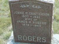 per GEDCOM of Sylvia Davis, Oct 13, 2009.1,8 James Martin Rogers appeared on the census of April 1901 at Murray Twp., Northumberland Co., Ontario; Age 28 at 1901 Census: Rogers, James, 28, b. Ont. r. Apr 22 1872, head, married; Jennie, 24, b. Ont. r. Mar 14 1877, wife, married; Joseph, 37, b. Ont. r. May 27 1867, brother, single; Chaterson, Edna, 16, b. Sep 12 1884, domestic, single (1901 Census: Murray Twp., dist. 95, sub-dist. g-1, pg. 1, line 32 - image not available.)3 He appeared on the census of 22 June 1921 at Murray Twp., Northumberland Co., Ontario; Age 49 at 1921 Census: Rogers, James, 49, b. Ont., p.b. Ont., Eng., Meth., farmer, married; Jennie, 43?, b. Ont., p.b. Ont., Eng., Meth., married; Thelma, 7, b. Ont., p.b. Ont., Meth. (1921 Census: Murray Twp., Northumberland Co., dist. 107, sub-dist. 32, pg. 8, line 44 - ancestry.ca)(Note: Charles T. Chatterson and family is above.)6 He died on 26 March 1943 at Conc A Lot 18, Murray Twp., Northumberland Co., Ontario, at age 70; Death Reg'n.#028259: Name: James Martin Rogers; Date: Mar 26 1943; Age: 70y 11m 4d; Place: Conc A, Lot 18, Murray Twp., lifetime; Born: Apr 22 1872, Murray Twp; Status: widowed; Nat.: Irish; Occ.: retired farmer, last 1941 for 50 years; Parents: James Rogers, b. Ireland & Jane Spencer, b. Ireland; Inf.: Mrs. Harry Whitney, Murray, daughter; Burial: Smithfield Cemetery, March 29 1943; Cause: prostatic obstruction; Phys.: Geo. A. Cronk?; Reg'd.: Mar 29 1943; Reg'r.: David Teal (Ontario Death Registration, #028259-1943, ancestry.ca) Date 1943 per Memorial. Date 1943 per GEDCOM of Steve Oler, Oct 13, 2009.1,2,9 He was buried on 29 March 1943 at Greenwood Cemetery, Smithfield, Northumberland Co., Ontario; Memorial: (see Exhibit) Jennie M. Chatterson; 1877 - 1941; Wife of; James M. Rogers; 1872 - 1943 (Greenwood Cemetery, Smithfield, July 9, 2004) per Death Reg'n.2,5