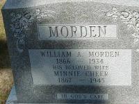 William Anderson Morden was born on 3 June 1866 at Rednersville, Prince Edward Co., Ontario; Date Jun 3 1866 & location Rednersville per Death Reg'n. Date Jun 2 1867 & location Ont. rural per 1901 Census. Date 1867 & location Ont. per 1891 Census. Date 1866 & location Prince Edward Co. per marr. reg'n. Date 1866 per Memorial.1,2,3,4,5 He lived on 5 October 1887 at Brighton, Northumberland Co., Ontario; Residence Brighton per marr. reg'n.1 He married Minnie Edna Cheer, daughter of Henry Cheer and Lucinda Victoria Davidson, on 5 October 1887 at Brighton, Northumberland Co., Ontario; Marriage Reg'n.#008687: Groom: William Anderson Morden; Age: 21; Res.: Brighton; Born: Prince Edward Co; Status: bachelor; Occ.: Gardener; Parents: Daniel & Harriet Morden; Bride: Minnie Edna Cheer; Age: 20; Res. & Born: Brighton; Status: spinster; Parents: Henry Cheer & Lucinda Davidson; Wit.: Frederick & Eva Leach, Brighton; Date: Oct 5 1887; Place: Brighton; Rel.: Meth; Performed by: John J. Leach; Reg'r.: M. K. Lockwood (Ontario Marriage Registration, #008687-1887, ancestry.com.)6 William Anderson Morden appeared on the census of April 1891 at Brighton Twp., Northumberland Co., Ontario; Age 24 at 1891 Census: Morden, William, 24, b. Ont., p.b. Ont., Meth., farmer, married; Minnie, 22, b. Ont., p.b. Ont., Meth., married; Ray, 2; Burton, 11/12 (1891 Census: Brighton Township, Northumberland Co., dist. 98, sub-dist. a-2, pg. 12, line 16 - ancestry.com.)4 He appeared on the census of April 1901 at Trenton, Hastings West Co., Ontario; Age 33 at 1901 Census: Morden, Wm. Anderson, 33, b. Ont. r. Jun (Jany?) 2 1867, Eng., Meth., ?shash?factor foreman, married; Minnie, 32, b. Ont. r. Jany? 29 1868, Eng., Meth., married; Pernous? Ray(m), 12, b. Ont. r. Oct 2 1888, son; Percival Roy, 10, b. May 22 1890, son; Alice Gladys?, 6, b. Ont. r. Aug 31 1894, daughter (1901 Census: Trenton Town, Hastings West Co., dist. 72, sub-dist. C - 6, pg. 9, line 37 - ancestry.com.)5 He died on 29 December 1934 at House of Refuge, John St., Whitby, Ontario Co., Ontario, at age 68; Death Reg'n.#025569: Name: William A. Morden; Date: Dec 29 1934; Age: 68y 6m 16?d; Born: Rednersville, Prince Edward co., Jun 3 1866; Place: House of Refuge, John St., Whitby, 66 days; Res.: Whitby; Status: married; Occ.: retired Chief of Police; Parents: Daniel Morden & Harriet McKim, b. Wellington, Prince Edward Co; Inf.: James M. Reed, Whitby, no rel; Burial: Trenton, Ont., Dec 31 1934; Und.: Pheers? Evans Servcie?, Whitby; Reg'd.: Dec 31 1934; Reg'r.: John R. ?Frost, Whitby (Ontario Death Registration, #025569-1934, ancestry.com) Date 1934 per Memorial.2,7 He was buried on 31 December 1934 at Mount Evergreen Cemetery, Trenton, Hastings Co., Ontario; Memorial: (See Memorial) MORDEN; William A. Morden; 1866 - 1934; His Beloved Wife; Minnie Cheer; 1867 - 1945 (Mount Evergreen Cemetery, Trenton, aug 28 2005.)2,3