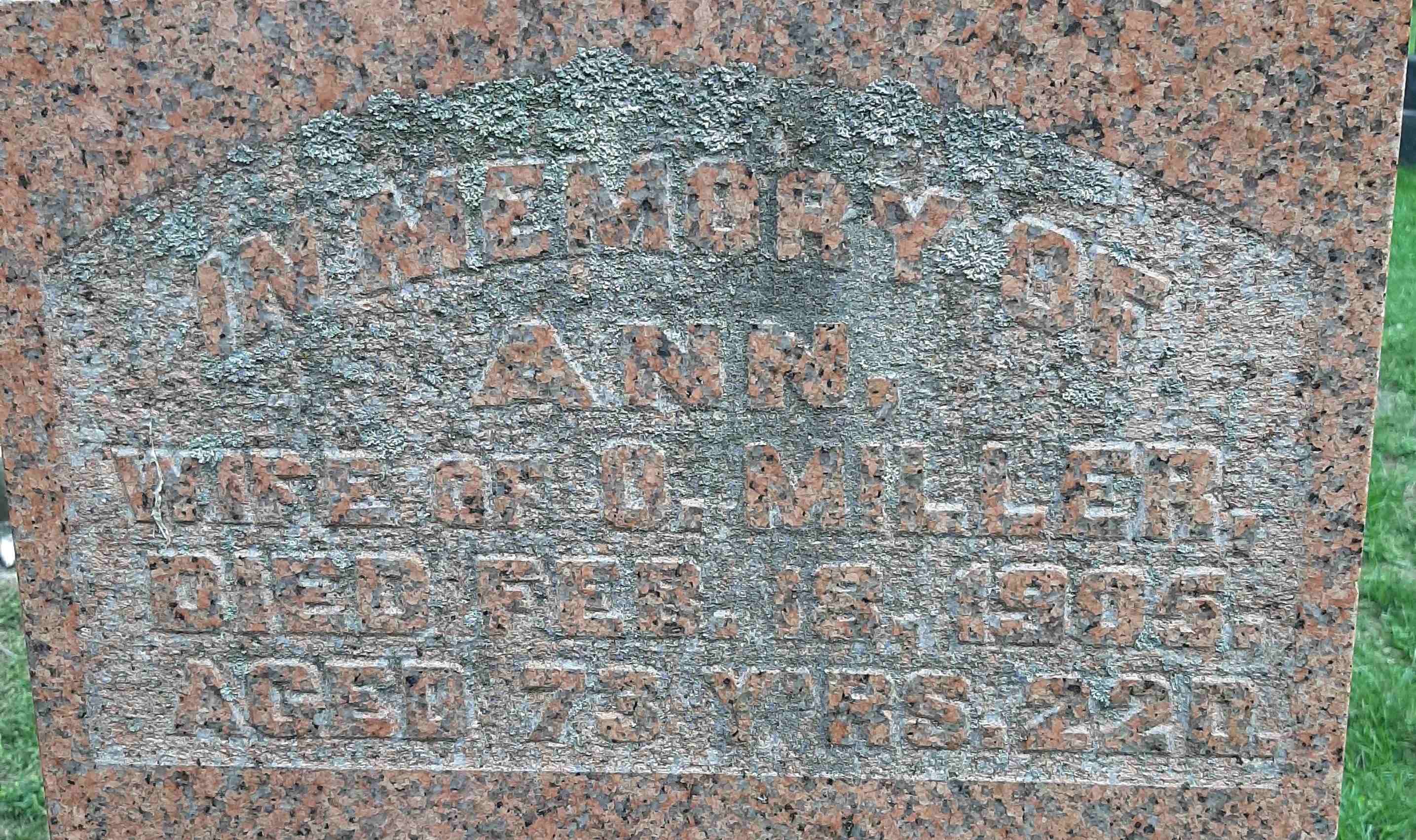 FindaGrave: Name: Ann Miller; BIRTH: unknown; DEATH: 18 Feb 1905; BURIAL: Mount Carmel Cemetery, Northumberland County, Ontario, Canada; MEMORIAL ID: 215482043; Note: Inscription: wife of O. Miller 73 Yr's 22 D (https://www.findagrave.com/memorial/215482043/ann-miller?_gl=1*a78jt7*_gcl_au*MTA4ODQwNjUxNC4xNjkwODMyNzkx*_ga*NTYwMjIyMjkyLjE2NzQ5Mzg5MDg.*_ga_4QT8FMEX30*ZDc2ZTU1ZTUtOTI0Yi00NTQ4LTkyODktZjQ3MjRiNDZlMmFmLjQ3OS4xLjE2OTM5Nzk0NjEuNTEuMC4w*_ga_QPQNV9XG1B*ZDc2ZTU1ZTUtOTI0Yi00NTQ4LTkyODktZjQ3MjRiNDZlMmFmLjEwLjEuMTY5Mzk3OTQ2MS4wLjAuMA..)