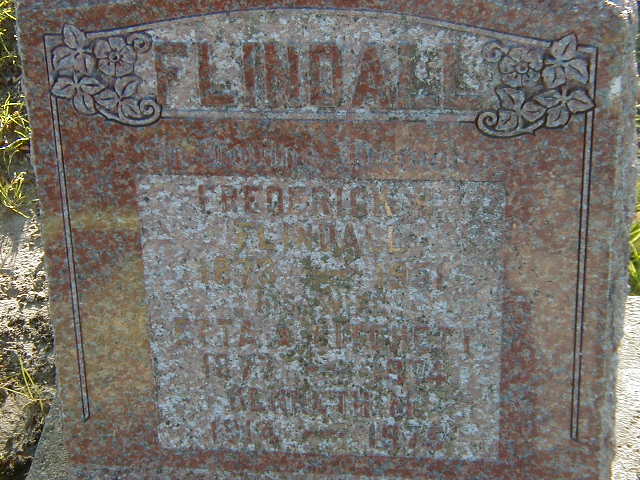 Frederick H. Flindall was born on 7 March 1873 at Murray Twp., Northumberland Co., Ontario; Birth Reg'n.#016376: Name: Frederick Herbert Flindall; Date: Mar 7 1873; Parents: Robert L. Flindall & Sarah May; Inf.: -- ??; Reg'd.: Apr 22 ; Reg'r.: M. Fieldhouse (Ontario Birth Registration, #016376-1873, ancestry.com) Date Mar 7 1874 & location Ont. rural per 1901 Census.1,3 He appeared on the census of April 1891 at Murray Twp., Northumberland Co., Ontario; Age 17 at 1891 Census: see Robert L. Flindall.4 He lived on 22 January 1896 at Murray Twp., Smithfield, Northumberland Co., Ontario; Witness at marriage of Fred A. May & Frances H. Evans.2 He appeared on the census of April 1901 at Murray Twp., Northumberland Co., Ontario; Age 27 at 1901 Census: see Robert Flindall.1 He lived on 17 February 1904 at Murray Twp., Northumberland Co., Ontario; Residence Murray Twp. per marr. reg'n.2 He married Etta Alberta Fitchett, daughter of Nelson James Fitchett and Mary Ann Morgan, on 17 February 1904 at Brighton, Northumberland Co., Ontario; Marriage Reg'n.#013415: Groom: Frederick H. Flindall; Age: 30; Res.: Murray Twp; Born: Cda; Status: bachelor; Occ.: farmer; Parents: Robert L. Flindall & Saraah L. May; Bride: Etta Alberta Fitchett; Age: 26; Res.: Murray Twp; Born: Cda; Parents: Nelson Fitchett & Mary Morgan; Wit.: H. L. Flindall & R. M. Fitchett, Brighton Twp; Date: feb 17 1904; Place: Brighton; Rel.: Eng. & Meth; Performed by: REv. Walter Frederick?; Reg'd.: May 23 1904; Reg'd.: James Lockwood (Ontario Marriage Registration, #013415-1904, ancestry.com.)5 Frederick H. Flindall lived on 15 March 1927 at R.R.#4, Trenton, Ontario; Informant for Death Reg'n. of his sister Jessie Lucinda Flindall.6 He died in 1951 at Ontario; Date 1951 per CEMSearch.7 He was buried in 1951 at St. George's Anglican Cemetery, Trenton, Northumberland Co., Ontario; Memorial: (See Exhibit) FLINDALL; Frederick H; Flindall; 1873 - 1951; His Wife; Etta A. Fitchett; 1877 - 1974; Kenneth M; 1914 - 1975 (St. George's Anglican Cemetery, Trenton, Sep 24 2005)