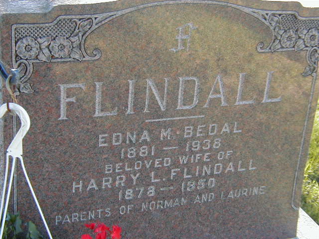 Harry L. Flindall was born on 29 May 1878 at Murray Twp., Northumberland Co., Ontario; Date 1878 per Memorial. Date May 1879 & location Ont. per 1911 Census. Date May 29 1880 & location Ont. rural per 1901 Census. Date 1880 & location Ont. per 1891 Census. per Death Reg'n. of his father. Date 1879 & location Murray Twp. per marr. reg'n.1,2,5,3,6,7 He appeared on the census of April 1891 at Murray Twp., Northumberland Co., Ontario; Age 11 at 1891 Census: see Robert L. Flindall.5 He appeared on the census of April 1901 at Murray Twp., Northumberland Co., Ontario; Age 20 at 1901 Census: see Robert Flindall.2 He lived on 17 February 1904 at Murray Twp., Northumberland Co., Ontario; Witness at marriage of Frederick H. Flindall & Etta Alberta Fitchett.3 He lived on 1 July 1907 at Murray Twp., Northumberland Co., Ontario; Residence Murray Twp. per marr. reg'n.3 He married Edna M. Bedal, daughter of Elias Bedal and Sarah A. Brown, on 1 July 1907 at Brighton Twp., Northumberland Co., Ontario; Marriage Reg'n.#015535: Groom: Harry J. Flindall; Age: 28; Res. & Born: Murray Twp; Status: bachelor; Occ.: farmer; Rel.: CE; Parents: Robert Flindall & Sarah May; Bride: Edna M. Bedal; Age: 25; Res. & Born: Brighton Twp; Status: spinster; Rel.: Meth; Parents: Elias Bedal & Sarah Brown; Wit.: Earl Bedal & Naidie Brown, Brighton Twp; Date: Jul 1 1907; Place: Brighton Twp; Performed by: A. H. Foster; Reg'r.: Fred O. Wade, Brighton Twp. (Ontario Marriage Registration, #015535-1907, ancestry.com.)8 Harry L. Flindall lived in 1911 at Conc A Lot 19 & 20, Murray Twp., Northumberland Co., Ontario; Residence per 1911 Census: Conc A, Lot 19 & 20, Murray Twp.6 He appeared on the census of 1911 at Murray Twp., Northumberland Co., Ontario; Age 32 at 1911 Census: Flindall, Harry, 32, b. Ont. May 1879, Eng., Meth., farmer, married; Edna, 30, b. Ont. Sep 1880, Eng., Meth., married; King, John, 11, b. Scotland Jul 1899, immig. 1911, Eng., Meth., adopted son (1911 Census: Murray Twp., dist. 101, sub-dist. 22, pg. 10, line line 50 - Conc A, Lot 19 & 20 - ancestry.com.)6 He lived on 30 April 1926 at Brighton Twp., Smithfield, Northumberland Co., Ontario; Informant for Death Reg'n. of his father Robert Leslie Flindall.1 He lived on 8 August 1934 at R. R. #4, Trenton, Northumberland Co., Ontario; Informant for Death Reg'n. of his mother Sarah Lucinda (May) Flindall.1 He was buried in 1950 at St. George's Anglican Cemetery, Trenton, Northumberland Co., Ontario; Memorial: (See Exhibit) FLINDALL; Edna M. Bedal; 1881 - 1938; Beloved Wife of; Harry L. Flindall; 1878 - 1950; Parents of Norman and Laurine (St. George's Anglican Cemetery, Trenton, Sep 24 2005)