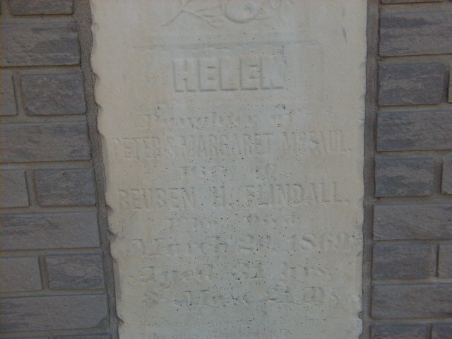 Note: Helen is a daughter of Peter McFaul & Margaret Hendricks per her Memorial.1,3 As of before 1854,her married name was Flindall.1 She married Reuben H. Flindall, son of John Franklin Flindall and Myra Ann Hawley, before 1854 at Ontario; per 1861 Census.1 Helen McFaul appeared on the census of April 1861 at Sidney Twp., Hastings Co., Ontario; Age 23 at 1861 Census: see Rueben Flindall.1 She died on 26 March 1869 at Trenton, Hastings Co., Ontario, at age 31; Date Mar 26 1869 per Memorial. Not in 1871 Census - husband Reuben Flindall is a widower.4,3 She was buried on 28 March 1869 at St. George's Anglican Cemetery, Trenton, Northumberland Co., Ontario; Memorial: (See Exhibit) HELEN; Daughter of; Peter & Margaret McFaul; Wife of; Reuben H. Flindall; Who Died; March 26, 1869; Aged 31 Yrs; 8? Mo's & 21 D's (St' George's Anglican Cemetery, Trenton, Sep 24 2005.)3