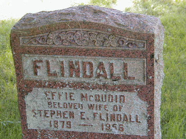 Note: Online images for 1881 Census show Effie McQuoid and her older sisters Henrietta and Nettie May at the top of page 21 but page 20 is not there or close by. Page 19 is just above.7 She appeared on the census of April 1901 at Brighton Twp., Northumberland Co., Ontario; Age 22 at 1901 Census: see Thomas McQuoid.4 As of 23 August 1903,her married name was Watson.5 She married William Watson, son of Allan Watson and Ann Cameron, on 23 August 1903 at Northumberland Co., Ontario; Marriage Reg'n.#013766: Groom: Wm. Watson; Age: 40; Res.: Toronto; Born: Huntingdon Twp; Status: bachelor; Occ.: Real Estate; Parents: Allan Watson & Ann Cameron; Bride: Effie McQuoid; Age: 24; Res.: Codrington; Born: Morganston; Status: spinster; Parents: Thos. McQuoid & Sarah Brickman; Wit.: E. & Rose, Broadbridge, Codrington; Date: Aug 26 1903; Rel.: Pres. & Meth; Performed by: McLeod, A. K; Reg'd.: Oct 6 1903; Reg'r.: Fred O. Wade (Ontario Marriage Registration, #013766-1903, ancestry.com.)8 Effie McQuoid married Stephen Edward Flindall, son of William Branch Flindall and Catharine Connell, circa 1950 at Ontario; "Effie McQuoid; Beloved Wife of; Stephen E. Flindall; 1879 - 1956" - per Memorial. 2nd wife??6 As of circa 1950,her married name was Flindall.6 Effie McQuoid was buried in 1956 at Mount Hope Cemetery, Brighton Twp., Northumberland Co., Ontario; Memorial: FLINDALL; Effie McQuoid; Beloved Wife of; Stephen E. Flindall; 1879 - 1956 (Mount Hope Cemetery, Brighton, Jul 10 2004.)6 She died in 1956 at Ontario; Date 1956 per Memorial.6