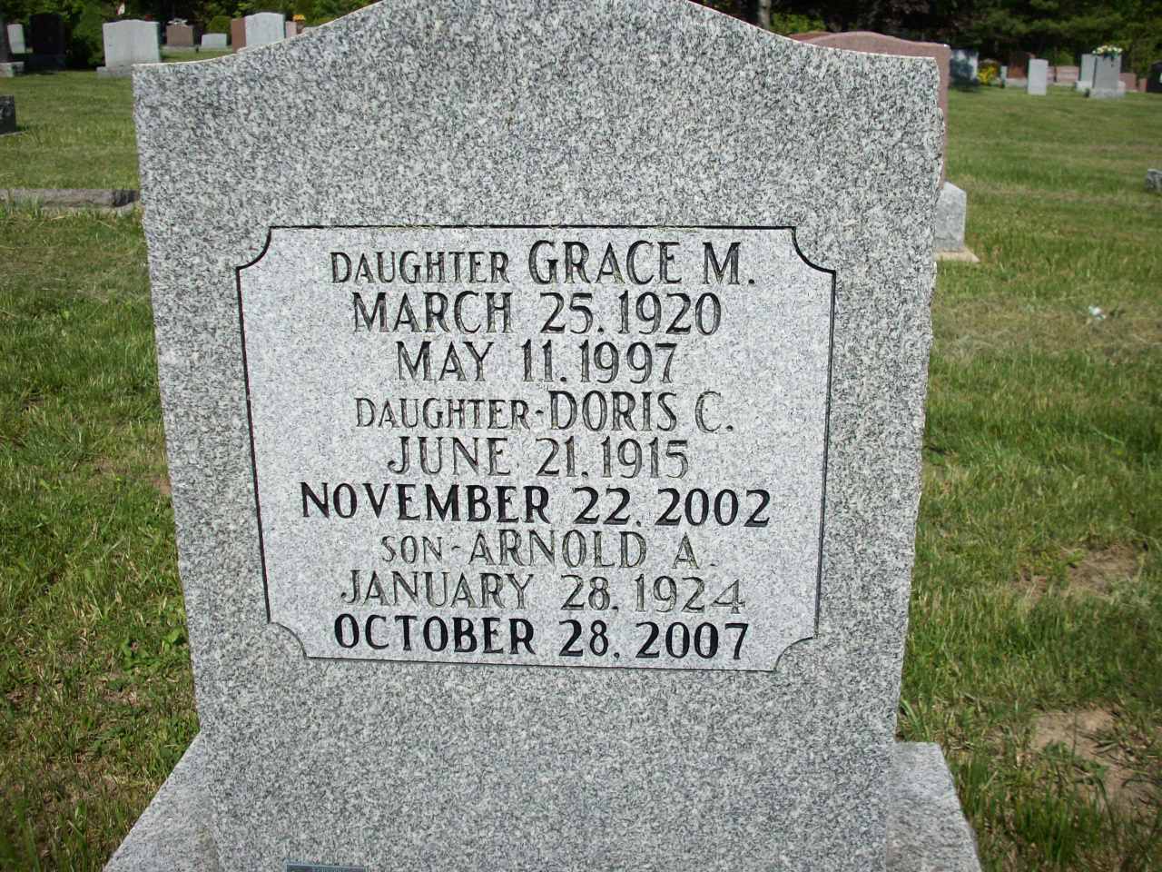 Grace M. Boes was born on 25 March 1920 at Brighton Twp., Northumberland Co., Ontario; Date Mar 25 1920 per Memorial. Date 1920 & location Ont. per 1921 Census.1,2 She appeared on the census of 1 June 1921 at Cramahe Twp., Northumberland Co., Ontario; Age 1 at 1921 Census: see Jacob Boes.2 She died on 11 May 1997 at Ontario at age 77; Date May 11 1997 per Memorial.1 She was buried on 13 May 1997 at Mount Hope Cemetery, Brighton, Northumberland Co., Ontario; Memorial: (See Exhibit) Daughter Grace M; March 25, 1920; May 11, 1997; Daughter Doris C; Jun 21 1915; November 22, 2002; Son - Arnold A; January 28, 1924; October 28, 2007 (Mount Hope Cemetery, Brighton, Jun 5 2009.)1