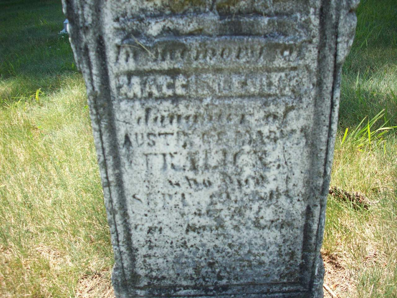 Marietta Fralick was born in 1861 at Ontario; Date c 1861 per Memorial. per GEDCOM of Richard Lander, Jan 29 2010.1,2 She died on 10 September 1861 at Cramahe Twp., Northumberland Co., Ontario; Date is unclear 0 Sept. 10 1861? per Memorial.2 She was buried on 12 September 1861 at Castleton Cemetery, Castleton, Northumberland Co., Ontario; Memorial: (See Exhibit) In Memory of; Ma..; daughter of; Austin & Mary; Fralick; Who Died; Sep 10 1861?; Aged ?? (Castleton Cemetery, Castleton, Jul 13 2009)