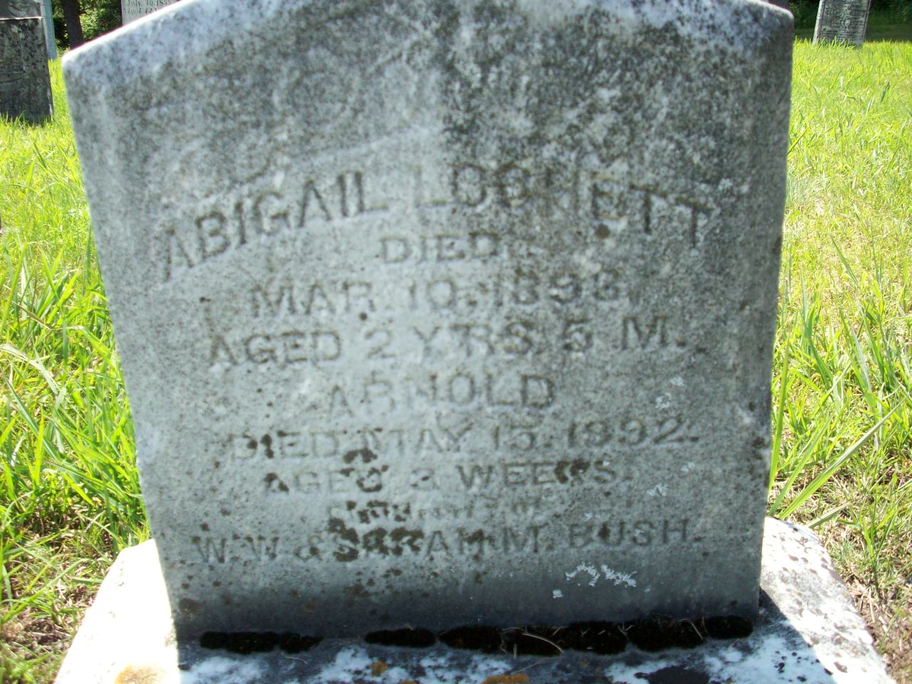 Abigail Lochett Bush was born in October 1895 at Cramahe Twp., Northumberland Co., Ontario; Date Oct 1895 per Memorial - age 2y 5m at death Mar 10 1898.1 She died on 10 March 1898 at Cramahe Twp., Northumberland Co., Ontario, at age 2; Date Mar 10 1898 per Memorial.1 She was buried on 12 March 1898 at Castleton Cemetery, Castleton, Northumberland Co., Ontario; Memorial: (See Exhibit) Abigail Lochett; Died; Mar. 10, 1898; Aged 2 Y'rs, 5 M; Arnold; Died May 13, 1992; Aged 3 Weeks; Children of; W. W. & Sarah M. Bush (Castleton Cemetery, Castleton, Jul 13 2009.)1