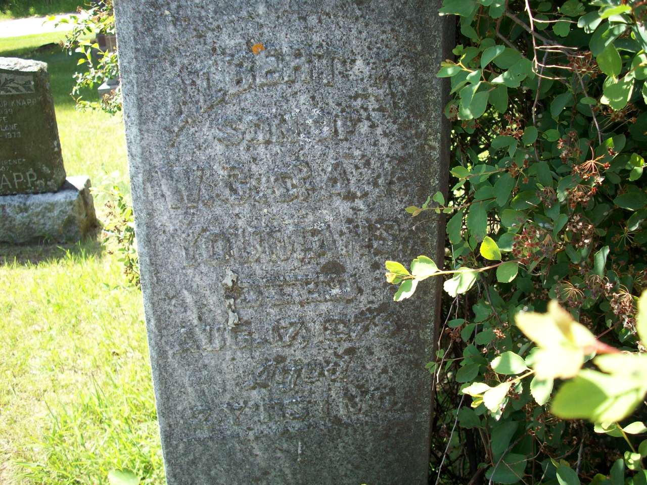 Albert A. Youmans was born in 1876 at Ontario; Date 1876 per CemSearch - age 2 at death Aug 17 1878. Date c. 1871 per Memorial - age 7 yrs ? at death Aug 17 1878.1,2 He died on 17 August 1878 at Cramahe Twp., Northumberland Co., Ontario; Date Aug 17 1878 per Memorial.1 He was buried on 19 August 1878 at Castleton Cemetery, Castleton, Northumberland Co., Ontario; Memorial: (See Exhibit) Albert ? ; Son of; W. C. & A; Youmans; Died; Aug 17, 1878; Aged; 7 y'rs 1 Mo? (Castleton Cemetery, Castelton, Jul 13 2009)