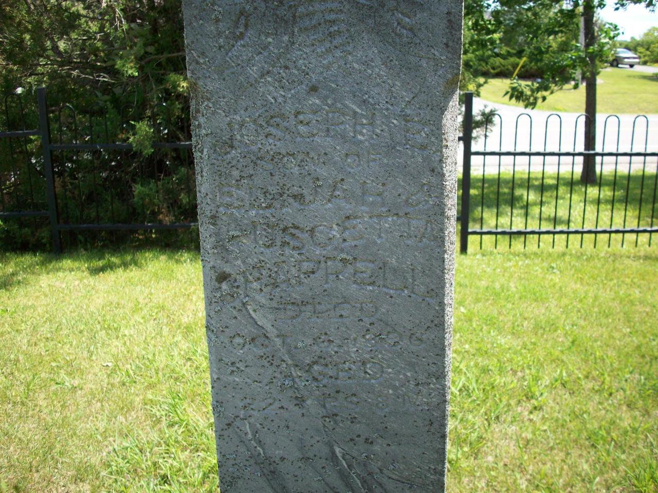 Joseph E. Chappell was born in February 1874 at Ontario; Date Feb 1874 per Memorial - age 22y 8m ?d at death Oct 6 1896.1 He died on 6 October 1896 at Cramahe Twp., Northumberland Co., Ontario, at age 22; Date Oct 6 1896 per Memorial.1 He was buried on 8 October 1896 at Castleton Cemetery, Castleton, Northumberland Co., Ontario; Memorial: (See Exhibit) Joseph E.?; Son of Elijah &; Luscetta; Chappell; Died; Oct 6, 1896; Aged; 22 Y'rs 8 M; ? D (Castleton Cemetery, Castleton, Jul 13 2009.)1
