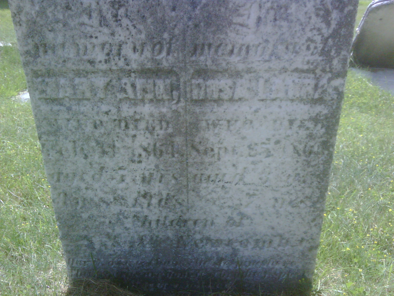 Rosa Laura Newcomb was born circa 1862 at Brighton Twp., Northumberland Co., Canada West; Date c 1862? per Memorial - dates are unclear. We know she was not in 1861 Census.1 She died on 8 September 1865 at Brighton Twp., Northumberland Co., Canada West; Date Sep 8? 1865? per Memorial - dates are unclear.1 She was buried on 10 September 1865 at Salem Cemetery, Cramahe Twp., Salem, Northumberland Co., Canada West; Memorial: (See Exhibit) In Memory of; Mary Ann; Who Died; Feb 3? 1864; Aged 5 Y'rs; 10? Mo's & 19 D's; Rosa Laura?; Who Died; Sept 8, 1865?; Aged 3? Y'rs..? ; Children of; (unclear) Newcomb (Salem Cemetery, Cramahe Twp., July 4, 2009)