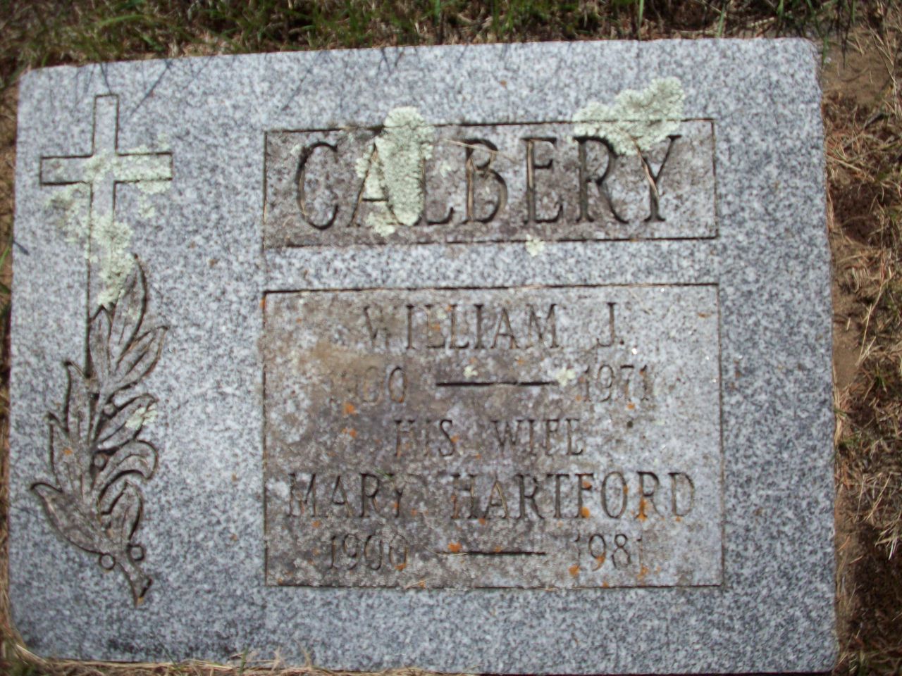 William John Calbery was born in 1900 at Haldimand Twp., Northumberland Co., Ontario; Date 1900 per Memorial. Date 1901 & location Haldimand Twp. per marr. reg'n.1,2 He lived on 1 March 1922 at Cramahe Twp., Northumberland Co., Ontario; Residence Cramahe Twp. per marr. reg'n.1 He married Mary Levens Hartford, daughter of James S. Hartford and Lucinda Maria Zufelt, on 1 March 1922 at Haldimand Twp., Centerton, Northumberland Co., Ontario; Marriage Reg'n.#011442: Groom: William John Calbery; Age: 21; Res.: Cramahe Twp; Born: Haldimand Twp; Status: bachelor; Occ.: farmer; Rel.: Anglican; Parents: John Calbery & Alice Ellis; Bride: Mary Lorena Hartford; Age: 21; Res. & Born: Cramahe Twp; Status: spinster; Rel.: Meth; Parents: J. F. Hartford & L. M. Zufelt; Wit.: Olove K. Lovelace, Centreton & Laura Wiggins, Cordova Mines; Date: Mar 1 1922; Place: Centreton, North Haldimand Twp; Performed by: J. N. Lovelace, Centreton, Meth; Sworn: Castleton, Mar 1 1922; Reg'r.: A. E. Jones (Ontario Marriage Registration, #011442-1922, ancestry.com.)3 William John Calbery was buried in 1971 at Castleton Cemetery, Castelton, Northumberland Co., Ontario; Memorial: (See Exhibit) Calbery; William J; 1900 - 1971; His Wife; Mary Hartford; 1900 - 1981 (Castleton Cemetery, Castleton, Jul 13 2009.)2 He died in 1971 at Ontario; Date 1971 per memorial.2