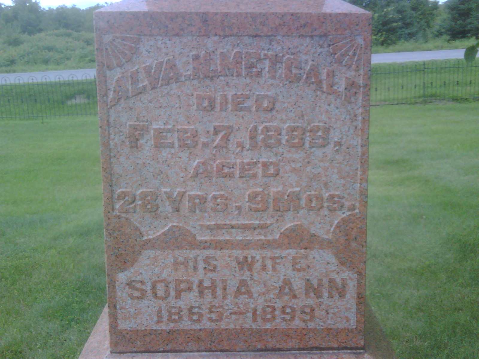 Alva Newton Metcalf was born in May 1860 at Marysburgh Twp., Prince Edward Co., Canada West; Date May 1860 per Memorial - age 28y 9m at death Feb 7 1889. Date 1861 & location Prince Edward Co. per Death Reg'n. Date 1860 & location CW per 1861 Census. Date 1861 & location Prince Edward Co. per marr. reg'n.1,2,3,4 He appeared on the census of April 1861 at Marysburgh Twp., Prince Edward Co., Canada West; Age 1 at 1861 Census: see John Metcalf.3 He lived on 15 January 1884 at Percy Twp., Northumberland Co., Ontario; Residence Percy Twp. per marr. reg'n.1 He married Sophia Ann MacKlam, daughter of Thomas Macklam and Elizabeth Hill Mullett, on 15 January 1884 at Brighton Twp., Northumberland Co., Ontario; Marriage Reg'n.#007825: Groom: Alva W. Metcalf; Age: 23; Res.: Percy; Born: Prince Edward Co; status: bachelor; Occ.: Hemp Maker; Parents: John & Elizabeth Metcalf; Bride: Sophia Ann Macklam; Age: 20; Res. & Born: Brighton; Status: spinster; Parents: Thomas & Elizabeth Macklam; Wit.: Celia Vincent, Brighton Village & T. F. Macklam, Y S?; Date: Jan 15 1884; Place: Brighton Twp; Rel.: CM & ME; Performed by: Peter W. Duncan (Ontario Marriage Registration, #007825-1884, ancestry.com.)5 Alva Newton Metcalf died on 7 February 1889 at Percy Twp., Northumberland Co., Ontario, at age 28; Death Reg'n.#012411: Name: Alva W. Metcalf; Date: Feb 7 1889; Age: 28; Occ.: harness maker; Born: Prince Edward Co; Cause: bronchitis & asthma, 10 mo; Phys.: N. D. Richards, MD; Inf.: John W. Rockhey, Percy Twp., harness maker; Reg'd.: Feb. 15 1889; Rel.: Meth; Reg'r.: R. P. Hurlbut, Percy Twp. (Ontario Death Registration, #012411-1889, ancestry.ca.)6 He was buried on 9 February 1889 at Salem Cemetery, Cramahe Twp., Salem, Northumberland Co., Ontario; Memorial: (see exhibit) Alva N. Metcalf; Died; Feb. 7, 1889; Aged; 28 Yrs, 9 Mos; His Wife; Sophia Ann; 1865-1899 (Salem Cemetery, Cramahe Twp., July 6, 2009.)4