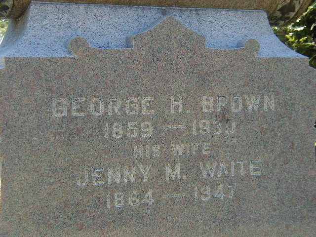 Note: Image is clear but writing is bad - fat nib??7 He lived in 1913 at Main St., Brighton, Northumberland Co., Ontario; Resident 17 years per Death Reg'n.3 He appeared on the census of 13 June 1921 at Brighton, Northumberland Co., Ontario; Age 60 at 1921 Census: Brown, George, 60, b. Ont., p.b. US & Ont., Eng., Meth., Merchant (agent ??), married; Jennie, 56, b. Ont., p.b. Ont., Eng., Meth., married (1921 Census: Brighton Village, Northumberland Co., dist. 107, sub-dist. 60, pg. 18, line 20 - ancestry.ca.)8 He died on 30 June 1930 at Main St., Brighton, Northumberland Co., Ontario, at age 68; Death Reg'n.#026636: Name: George Hopstill Brown; Date: Jun 30 1930; Age: 69y 8m 12d; Res.: Main St., Brighton, 17 yrs., 50 yrs. in Ont; Born: Onct 21 1861, Ont; Status: married; Occ.: Agent, Selling Implements; Parents: Geroge H. Brown, b. New York State & Tryphena Lent, b. Northumberland Co; Inf.: H. F. Foote, 809 George St., Peterboro, brother-in-law; Burial: Zion Cemeetery, Jul 2 1930; Und.: B. e. Brintnell, Brighton; Reg'd.: Jul 2 1930; Reg'r.: Oscar L. Morrow, Brighton (Ontario Death Registration, #026636-1930, ancestry.com) per GEDCOM of Don & Jeanne Ross, Feb 27 2010.1,13 He was buried on 2 July 1930 at Waite Cemetery, Cramahe Twp., Northumberland Co., Ontario; Memorial: (See Exhibit) George H. Brown; 1859 - 1930; His Wife; Jenny M. Waite; 1864 - 1941 (Waites Cemetery, Cramahe Twp., Jul 3 2004) Zion Cemetery per Death Reg'n. - likely means Waite's Cemetery.