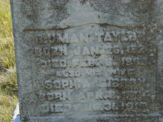 CEMSearch: Name: Luman Taylor; Born: 1826-01-26; Died: 1899-02-06; Notes: Husband of Sophia Gibson; Buried: Woods Cemetery, Cramahe Twp; Other names: Adelia Jobes (Taylor) 1857-1933), Sophia Taylor (Gibson) (1824-1918.)4,11
