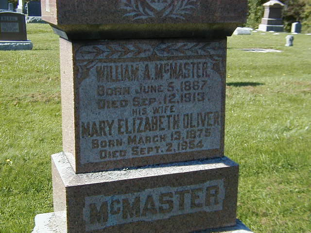 William A. McMaster was born on 5 June 1867 at Brighton Twp., Northumberlnad Co., Ontario; Date Jun 5 1867 per Memorial. Date 1867 & location Ont. per 1891 Census. Date 1867 & location Ont. per 1881 Census. Date 1867 & location Ont. per 1871 Census.1,3,4,2 He appeared on the census of April 1871 at Brighton Twp., Northumberlnad Co., Ontario; Age 4 at 1871 Census: see Samuel McMasters.1 He appeared on the census of April 1881 at Brighton Twp., Northumberlnad Co., Ontario; Age 14 at 1881 Census: see Samuel McMasters.3 He appeared on the census of April 1891 at Brighton Twp., Northumberland Co., Ontario; Age 24 at 1891 Census: see Samuel McMasters.4 He married Mary Elizabeth Oliver circa 1900 at Ontario; per Memorial.2 William A. McMaster died on 12 September 1913 at Ontario at age 46; Date Sep 12 1913 per Memorial.2 He was buried on 14 September 1913 at Mount Hope Cemetery, Brighton, Northumberland Co., Ontario; Memorial: (See Exhibit) William A. McMaster; Born June 5, 1867; Died Sep 12, 1913; His Wife; Mary Elizabeth Oliver; Born: March 13, 1875; Died Sep. 2, 1954; McMASTER (Mount Hope Cemetery, Brighton, Sep 26 2004.)2