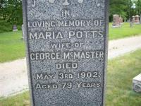 Maria Potts was born on 15 October 1822 at Upper Canada; Date 1822 per Memorial & CemSearch. Date Oct 15 1822 & location Ont. rural per 1901 Census. Date 1824 & location Ont. per 1881 Census. Date 1825 & location Ont. per 1871 Census. Date 1824 & location UC per 1861 Census.1,2,3,4,5,6 As of 1842,her married name was McMaster.1 She married George McMaster, son of James McMasters Jr. and Frances Powers, in 1842 at Murray Twp., Northumberland Co., Canada West; "George McMasters (1823-1906) married Maria Potts of Smithfield in 1842 and settled on lot 24 next to his brother Robert. They had a family of twelve. The oldest child, William, left for Texas in the late 1800's where he had a son, George. He and his wife, Mary, returned to the second concession around the turn of the century, but the son remained in Texas. They adopted Maude Penny, who was a seamstress in the Smithfield area known to many simply as "Maudie Mac". George's second child was Emily, who married Malcolm Terry. They had one child, Florence, who married Burton George of Smithfield; they were the parents of Frank George, a well known reeve of Brighton Township and warden for Northumberland County." from article "The McMasters of the Second Concession" on pages 57 & 58 of "Brighton Township" by Florence Chatten, published in 2009.
