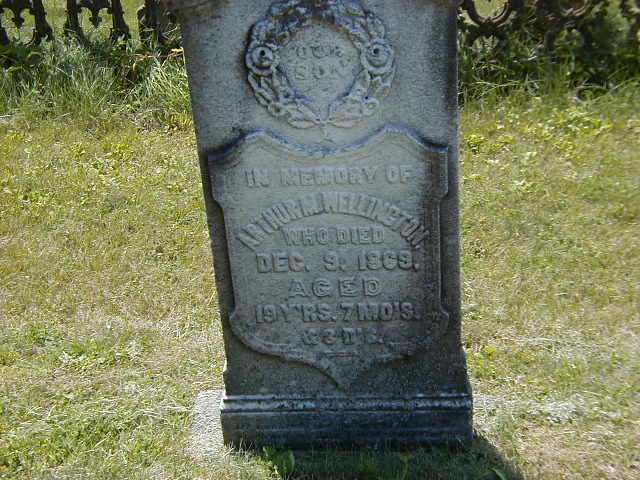 Arthur Melbourne Wellington was born in 1849 at Brighton, Northumberland Co., Canada West; Date 1848 & location Brighton per Death Reg'n. Date 1850 & location UC per 1861 Census. Date 1849 & location Cda. per 1851 Census.1,2,3 He appeared on the census of 1852 at Brighton Twp., Northumberland Co., Canada West; Age 2 at 1851 Census: see Isaac Wellington.1 He appeared on the census of April 1861 at Brighton, Northumberland Co., Canada West; Age 11 at 1861 Census: see Isaac M. Wellington.2 He died on 9 December 1869 at Brighton, Northumberland Co., Ontario; Death Reg'n.#002255: Name: Arthur Melbourne Wellington; Date: Dec 9 1869; Age: 19; Born: Brighton; Cause: diabetes; Phys.: Dr. A. E. Fife; Inf.: Isaac M. Wellington; Reg'd.: Dec 19 1869; Rel.: WM; Reg'r.: M. K. Lockwood (Ontario Death Registration, #002255-1869, ancestry.com.)4 He was buried on 11 December 1869 at Mount Hope Cemetery, Brighton, Northumberland Co., Ontario; Memorial: (See Exhibit) In Memory Of; Arthur M. Wellington; Who Died; Dec. 9, 1869; Aged; 19 Y'rs. 7 Mo's; & 3 D's (Mount Hope Cemetery, Brighton, July 10 2004.)5