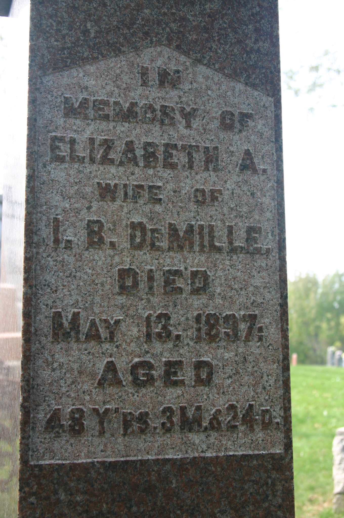 "(4) Isaac B. DeMille, m. Elizabeth Wellington; set. Brighton. Issue: (a) Arthur DeMille, d. y; (b) Rev. C. W. DeMille, m. Annie Web; set. Roblin; (c) Maitie DeMille, m. W. E. Blakely, Jeweller; set. Trenton. Issue: Arthur (d.y.); (d) Thorhilda DeMille, unm., student, Newton Highschool." pg. 292, Pioneer Life On the Bay of Quinte.2,9 Elizabeth Ann Wellington appeared on the census of April 1871 at Brighton, Northumberland Co., Ontario; Age 21 at 1871 Census: see Isaac B. DeMille.5 She appeared on the census of April 1881 at Brighton, Northumberland Co., Ontario; Age 32 at 1881 Census: see Isaac B. DeMille.7 She appeared on the census of April 1891 at Brighton, Northumberland Co., Ontario; Age 42 at 1891 Census: see Isaac B. DeMille.8 She died on 13 May 1897 at Brighton, Northumberland Co., Ontario, at age 48; Death Reg'n.#017463: Name: Mrs. E. A. DeMille; Date: May 13 1897; Age: 48; Res.: Main St., Brighton; Status: housewife; Born: Brighton; Phys. & Inf.: Dr. C. M. Sanford; Rel.: Meth; Reg'd.: May 14 1897; Reg'r.: J. H. Morrow (Ontario Death Registratin, #017463-1897, ancestry.com.)10 She was buried on 15 May 1897 at Mount Hope Cemetery, Brighton, Northumberland Co., Ontario; Memorial: (See Exhibit) In; Memory of; Elizabeth A; Wife of; I. B. DeMille; Died; May 13, 1897; Aged; 48 Y'rs. 3 M. & 24 D. (Mount Hope Cemetery, Brighton, Oct 3 2005.)4
