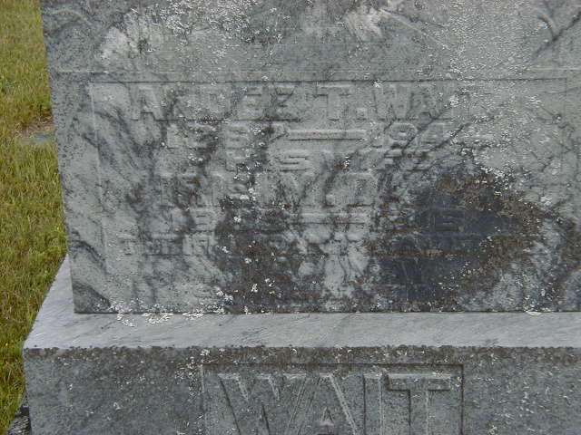 CEMSearch: Name: B. J. Wait; Born: - ; Died: 1905-06-18; Age: 87y 6m; Buried: Eddystone Cemetery, Haldimand Twp., Conc 4, Lot 17; Other names: Addison Wait ( -1872), Lavinia Wait (?)(1857-1942), Sarah Wait (Turney)( -1879.)2,8