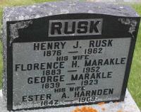 CemSearch: Name: George Marakle; Born: Jun 16 1839; Died: Mar 13 1923; Age: 83y 9m; ID: WELCUNB2243; Other names: Marakle, Esther Ann [Harnden] (1842-1909), Rusk, Florence Helena [Marakle] (1883-1952), Rusk, Henry James (1876-1962); Cemeter: Welcome United Church Cemetery, Conc 2, Lot 11, Hamilton Twp., Northumberland Co., Sec B2 row 02 Plot 243; Note: Husband of Esther. (https://www.cemsearch.ca/burial/?pid=WELCUNB2243%5E1.)3,4