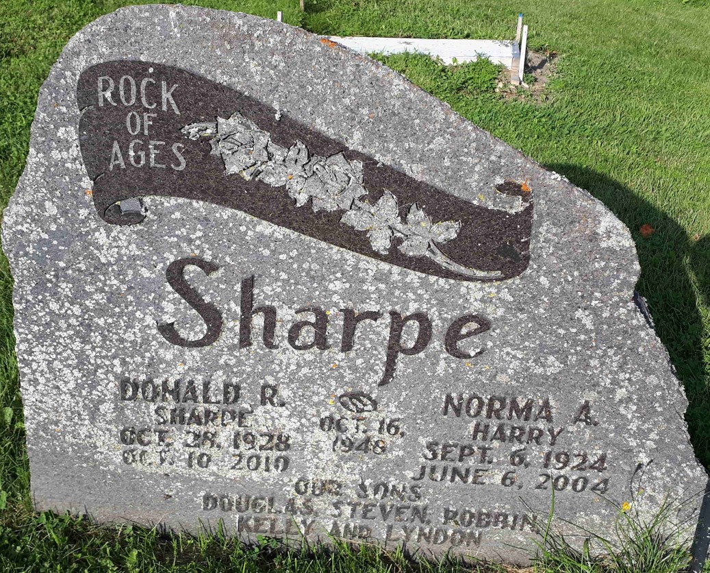 per family tree of marthur93 on ancestry.ca, Apr 20 2021.3,1,2 He was buried on 13 October 2010 at Carman Cemetery, Brighton Twp., Carman, Northumberland Co., Ontario; Memorial: (see Exhibit) Rock of Ages; Sharpe; Donald R; Sharpe; Oct. 28, 1928; Oct. 10, 2910; Oct. 16, 1948; Normal A; Harry; Sept. 6, 1924; June 6, 2004; Our Sons; Douglas, Steven, Robbin; Kelly and Lyndon (Carman Cemetery, Brighton Twp., image by Dan Buchanan, Aug 12 2023.)2