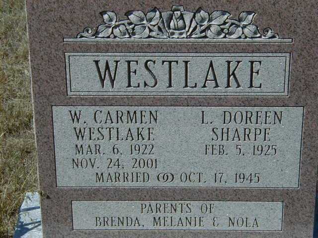 W. Carmen Westlake was born on 6 March 1922 at Ontario; Date Mar 6 1922 per Memorial. per Obit of Donald Ray Sharpe.1,3 He married Laura Doreen Sharpe, daughter of Stewart Godfrey Sharpe and Mary Edna Loomis, on 17 October 1945 at Ontario; Date Oct 17 1945 per Memorial. per Obit of Donald Ray Sharpe.1,3 W. Carmen Westlake died on 24 November 2001 at Campbellford, Northumberland Co., Ontario, at age 79; Date Nov 24 2001 per Memorial. per GEDCOM of Jim Baker (wesslingbaker@gmail.com) Sep 25 2017. Date Nov 24 2001 & location Campbellford per family tree of marthur93 on ancestry.ca, Apr 20 2021.2,3,4 He was buried on 27 November 2001 at Mount Zion Cemetery, Murray Twp., Northumberland Co., Ontario; Memorial: (see Exhibit) WESTLAKE; W. Carmen; Westlake; Mar. 6, 1922; Nov. 24, 2001; L. Doreen; Sharpe; Feb. 5, 1925; - ; Married Oct. 17, 1945; Parents of; Brenda, Melanie & Nola (Mount Zion Cemetery, Murray Twp., Aug 7, 2005.)3