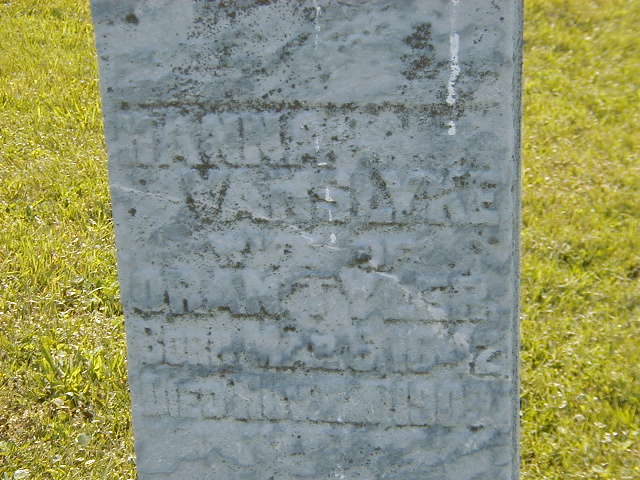 Hannah M. Vanslyke was born on 5 March 1842 at Cramahe Twp., Northumberland Co., Canada West; Date Mar 5 1842 per Memorial. Date Mar 6 1842 per CemSearch. Date 1840 & location Ont. per 1881 Census. Date 1838 & location Ont. per 1871 Census. Date 1838 & location UC per 1861 Census.1,2,3,4,5 She appeared on the census of April 1861 at Brighton Twp., Northumberland Co., Canada West; Age 23 at 1861 Census: see Marcellius Vanslyke.1 As of circa 1862,her married name was Tyler.3 She married Oran Tyler, son of Orrin Tyler and Lydia ?, circa 1862 at Canada West; per 1871 Census. per CemSearch.3,5 Hannah M. Vanslyke appeared on the census of April 1871 at Brighton Twp., Northumberland Co., Ontario; Age 33 a t1871 Census: see Marcellus Vanslyke.3 She appeared on the census of April 1881 at Brighton Twp., Northumberland Co., Ontario; Age 41 at 1881 Census: see Marcelius Vanslyke (father.)2 She appeared on the census of April 1891 at Brighton Twp., Northumberland Co., Ontario; Age 51 at 1881 Census: see Marcellus Vanslyke.2 She died on 22 November 1909 at Brighton Twp., Northumberland Co., Ontario, at age 67; Date Nov ?22? 1909 per Memorial. Date Nov 1909 per CemSearch.4,5 She was buried on 24 November 1909 at Hilton Cemetery, Brighton Twp., Hilton, Northumberland Co., Ontario; Memorial: (See Exhibit) Hannah; VanSlyke; Wife of; Oran Tyler; Born Mar 5, 1842; Died Nov ?22? 1909 (Hilton Cemetery, Jul 10 2004)