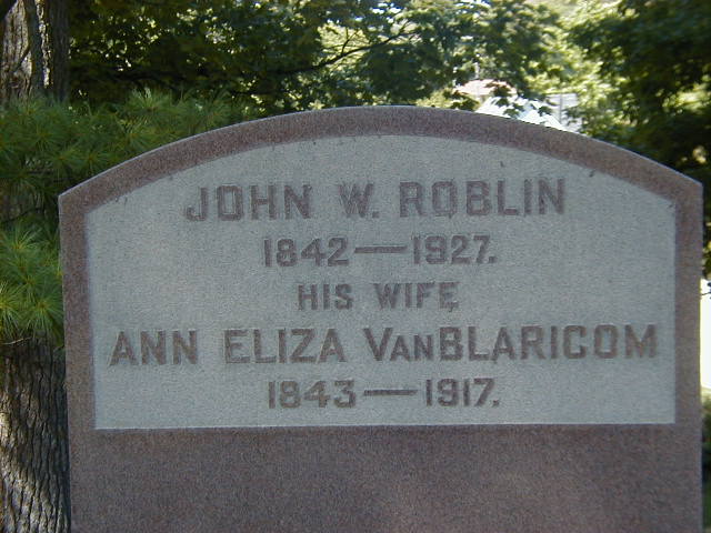 Ann Elizabeth Van Blaricom was born on 24 December 1843 at Ontario; Date 1843 per Memorial. Date Dec 24 1843 & location Ont. urban per 1901 Census. Date 1844 & location Ont. per 1891 Census. Date 1844 & location Ont. per 1881 Census. Date 1844 & location Ont. per 1871 Census. Date 1843 & location Cda. per marriage register. Date Dec 24 1843 per GEDCOM of Tim Ryeland, Feb 13 2011.1,2,3,4,5,7,8 She lived on 13 October 1865 at Sophiasburgh Twp., Prince Edward Co., Ontario; Residence Sophiasburgh Twp. per marriage register.3 As of 13 October 1865,her married name was Roblin.1 She married John Wesley Roblin, son of John Wesley Roblin and Deborah Ann Rightmyer, on 13 October 1865 at Prince Edward Co., Ontario; Marriage Register: Groom: John Wesley Roblin; Age: 23; Res.: Sophiasburgh; Born: Cda; Parents: John Roblin & Deborah Blackmeyers; Bride: Ann Elizabeth Vanblaricom; Age: 21; Res.: Sophiasburgh; Born: Cda; Parents: Elish Vanblaricom & Elizabeth Davis; Date: Oct 13 1865; Place: Prince Edward Co. (Ontario Marriage Register, ancestry.com) per GEDCOM of Tim Ryeland, Feb 13 2011.1,3 Ann Elizabeth Van Blaricom appeared on the census of April 1871 at Hallowell Twp., Prince Edward Co., Ontario; Age 27 at 1871 Census: see John W. Roblin.8 She appeared on the census of April 1881 at Picton, Prince Edward Co., Ontario; Age 37 at 1881 Census: see John W. Roblin.7 She appeared on the census of April 1891 at Picton, Prince Edward Co., Ontario; Age 47 at 1891 Census: see John W. Roblin.4 She appeared on the census of 18 April 1901 at Picton, Prince Edward Co., Ontario; Age 57 at 1901 Census: see John W. Roblin.5 She appeared on the census of 1911 at Picton, Prince Edward Co., Ontario; Age 67 at 1911 Census: see John W. Roblin.6 She died in 1917 at Ontario; Date 1917 per Memorial. per GEDCOM of Tim Ryeland, Feb 13 2011.1,2 She was buried in 1917 at Glenwood Cemetery, Picton, Prince Edward Co., Ontario; Memorial: (See Exhibit) John W. Roblin; 1842-1927; His Wife; Ann Eliza VanBlaricom; 1843-1917 (Glenwood Cemetery, Picton, Aug 24 2003.)2