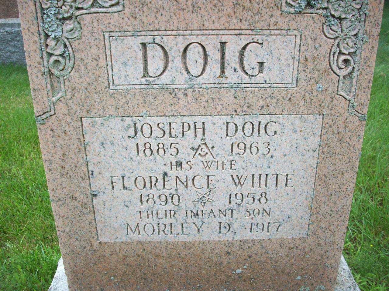 Joseph Doig was born on 3 December 1885 at Brechin Twp., Simcoe Co., Ontario; Late Birth Reg'n.#901322: Name: Joseph Doig; Date: Dec 3 1885; Place: Brechin, Ont; Father: Alexander Doig, 40, born Brechin, miller; Mother: Eida Eliza Fennel; Inf.: Elizabeth Crouter, Trenton, oldest sister; Reg'd.: Mar 10 1942 (Ontario Late Birth Registration, #901322-1942, ancestry.ca) Date 1885 per Memorial & CemSearch. Date Dec 3 1885 & location Brechin per family tree of eblack135 on ancestry.com, Feb 20 2011. Date 1886 & location Brechin per marr. reg'n.1,2,3,4,5 He lived on 19 June 1912 at Brighton Twp., Smithfield, Northumberland Co., Ontario; Residence Smithfield per marr. reg'n.1 He married Florence Iris White, daughter of William A. White and Sarah Jane Greene, on 19 June 1912 at Brighton Twp., Northumberland Co., Ontario; Marriage Reg'n.#014837: Groom: Joseph Doige; Age: 26; Res.: Smithfield; Born: Brechin; Status: bachelor; Rel.: Meth; Parents: Alexander Doige, farmer & Ida Fennell; Bride: Florence ?Hazel? White; Age: 22; Res. & Born: Smithfield; Status: spinster; Rel.: Meth; Parents: William W?? White, miller & Sarah J. Green; Wit.: Darwin J. White, Smithfield & Hazel M. Spafford, Brighton; Date: Jun 19 1912; Place: Brighton Twp; Performed by: W. S. Boyce, Smithfield; Sworn: Trenton, Jun 17 1912; Reg'r.: J. Rixon (Ontario Marriage Registration, #014837-1912, ancestry.com.)6 Joseph Doig was buried in 1963 at Greenwood Cemetery, Smithfield, Northumberland Co., Ontario; Memorial: (See Exhibit) DOIG; Joseph Doig; 1885 (Masonic Symbol)- 1963; His Wife; Florence White; 1890 (Eastern Star Symbol)-1958; Their Infant Son; Morley D. 1917 (Greenwood Cemetery, Smithfield, June 30 2013)