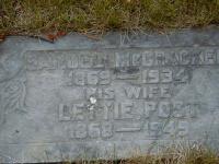First wife of Samuel McCracken was Fanny Usborne, married Dec 14 1892 per CemSearch.9,10 Samuel McCracken married Letitia May "Lettie" Post, daughter of Samuel Post and Jane Anna Armstrong, before 1898; per marriage reg'n. of son Robert Graydon McCracken.1 Samuel McCracken appeared on the census of 18 April 1901 at Cramahe Twp., Northumberland East Co., Ontario; Age 32 at 1901 Census: McCracken, Sam'l, 32, b. Ont. u. Nov 20 1862, Irish, Meth., farm lab., married; Lettie, 32, b. Ont. r. Oct 29 1868, Ger., Meth., married; McLean, Katie S.(f), 7, b. Ont. r. Jun 2 1893, daughter, Irish, Meth., daughter; McCracken, Robert G., 1, b. Ont. r. Aug 20 1899, Irish, Meth., son (1901 Census: Cramahe Twp., Northumberland East Co., dist. 95, sub-dist. e-1, pg. 5, line 25 - ancestry.com.)3 He died on 3 September 1934 at Cramahe Twp., Colborne, Northumberland Co., Ontario, at age 65; Death Reg'n.#024786: Name: Samuel McCraken; Date: Sep 3 1934; Age: 65y 9m 14d; Res.: Cramahe Twp. (Colborne), 10y; Born: Nov 22 1868, Ont; Status: married; Occ.: carpenter; Parents: George McCracken & Eliza Cyle, both b. Ont; If.: George McCracken, Colborne, brother; Burial: Union Cemetery, Colborne, Sep 5 1934; Und.: McCracken McCarthur, Colborne; Cause: died suddenly, coronary thrombosis; Phys.: A. C. McGlenon; Reg'd.: Sep 5 1934; Reg'r.: G. R. Beavis, Colborne (Ontario Death Registration, #024785-1934, ancestry.ca)(Note: Date of Birth was initially Nov 22 1971 and later changed to Nov 20 1868. Month in age was changed from 10 to 9.) Date 1934 per Memorial.4,11 He was buried on 5 September 1934 at Colborne Union Cemetery, Colborne, Northumberland Co., Ontario; Memorial: (See Exhibit) Samuel McCracken; 1869 - 1934; His Wife; Lettie Post; 1868 - 1949 (Colborne Union Cemetery, Colborne, May 23 2005)