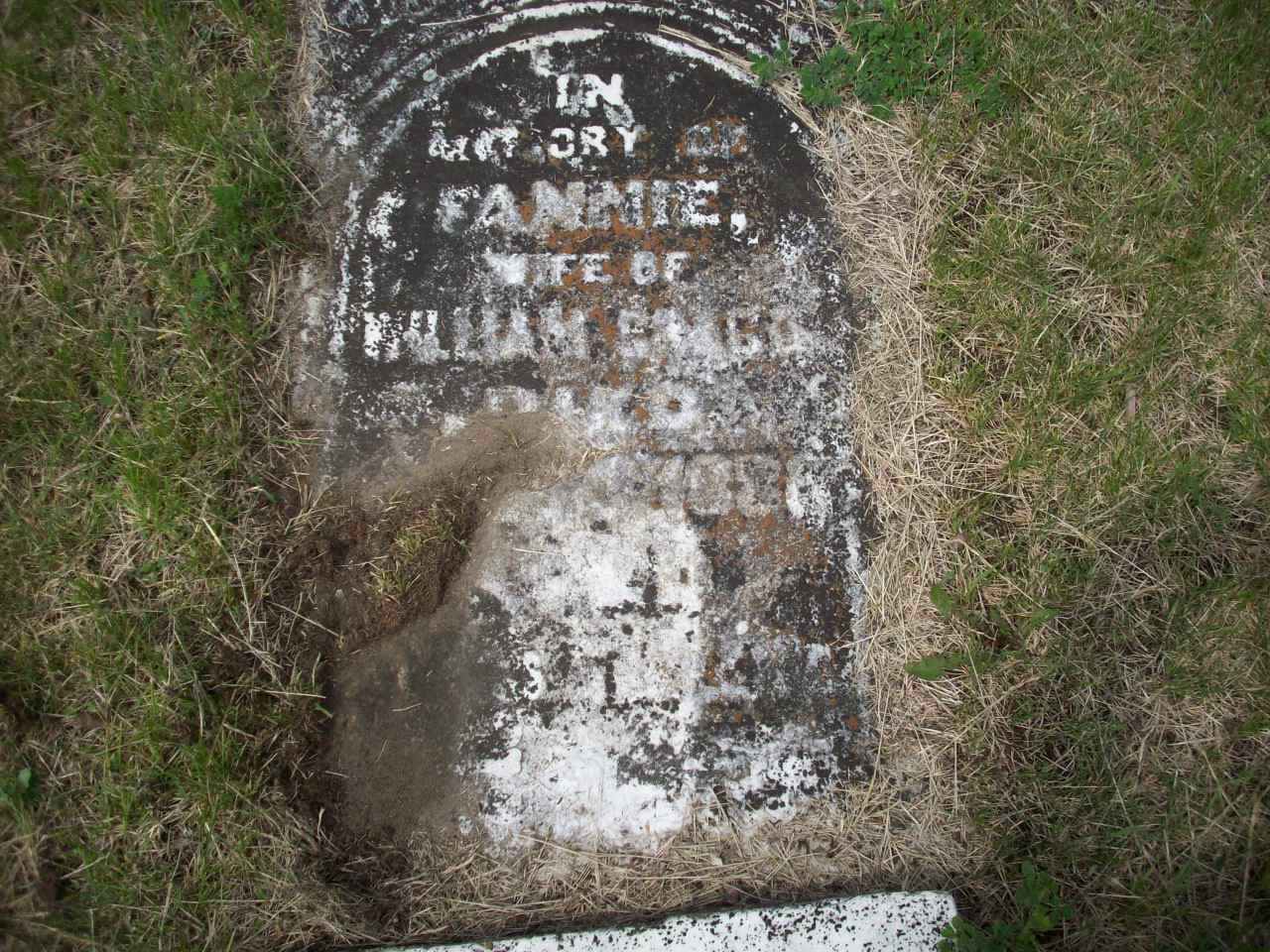 Note: Old stone lying down, broken in middle, lower part unreadable. Top is better - the names FANNIE and William Cragg are very clear.6