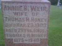 Annie Beatrice Weir was born on 31 August 1873 at Alnwick Twp., Northumberland Co., Ontario; Date Sep 1873 per Memorial - age 29y 6m at death Mar 23 1903. Date 1874 per CemSearch. Date Aug 31 1873 & location Ont. rural per 1901 Census. Date 1873 & location Alnwick Twp. per marriage reg'n. Date Aug 31 1873 & location Alnwick Twp. per family tree of Alfred_Honey on ancestry.com, Feb 23 2012. per marriage reg'n. of daughter Effie Isabelle ( Honey) Merrill.1,2,5,3,4 She married Thomas Henry Honey, son of James Honey and Jane Sanders, on 15 August 1896 at Percy Twp., Warkworth, Northumberland Co., Ontario; Marriage Reg'n.#009236: Groom: Thomas Henry Honey; Age: 22; REs. & Born: Percy Twp; Status: bachelor; Occ.: farmer; Parents: James & Jane Honey; Bride: Annie Beatrice Weir; Age: 22; Res.: Percy Twp; Born: Alnwick Twp; Status: spinster; Parents: William & Isabella Weir; Wit.: Willie & Libbie Peake, Norham; Date: Aug 15 1896; Place: Norham; Rel.: Meth; Performed by: W. H. Peake, Norham; Reg'r.: R. P. Hurlbut, Percy Twp. (Ontario Marriage Registration, #009236-1896, ancestry.com) Date Aug 15 1896 & location Warkworth per family tree of Alfred_Honey on ancestry.com, Feb 23 2012. per marriage reg'n. of daughter Effie Isabelle ( Honey) Merrill.6,2 Annie Beatrice Weir lived on 15 August 1896 at Percy Twp., Northumberland Co., Ontario; Residence Percy Twp. per marriage reg'n.1 As of 15 August 1896,her married name was Honey.1 She appeared on the census of 6 April 1901 at Haldimand Twp., Northumberland Co., Ontario; Age 27 at 1901 Census: see Thomas H. Honey.4 She died on 23 March 1903 at Ontario at age 29; Date Mar 23 1903 per Memorial & CEMSearch. Date Mar 23 1903 per family tree of Alfred_Honey on ancestry.com, Feb 23 2012.2,5,3 She was buried on 25 March 1903 at Warkworth Cemetery, Warkworth, Northumberland Co., Ontario; Memorial: (See Exhibit) Annie B. Weir; Wife of; Thomas H. Honey; Died Mar. 23, 1903; Aged 29Yrs, 6 Mos; Thomas H. Honey; 1875-1940 (Warkworth Cemetery, Warkworth, Jul 7 2009)