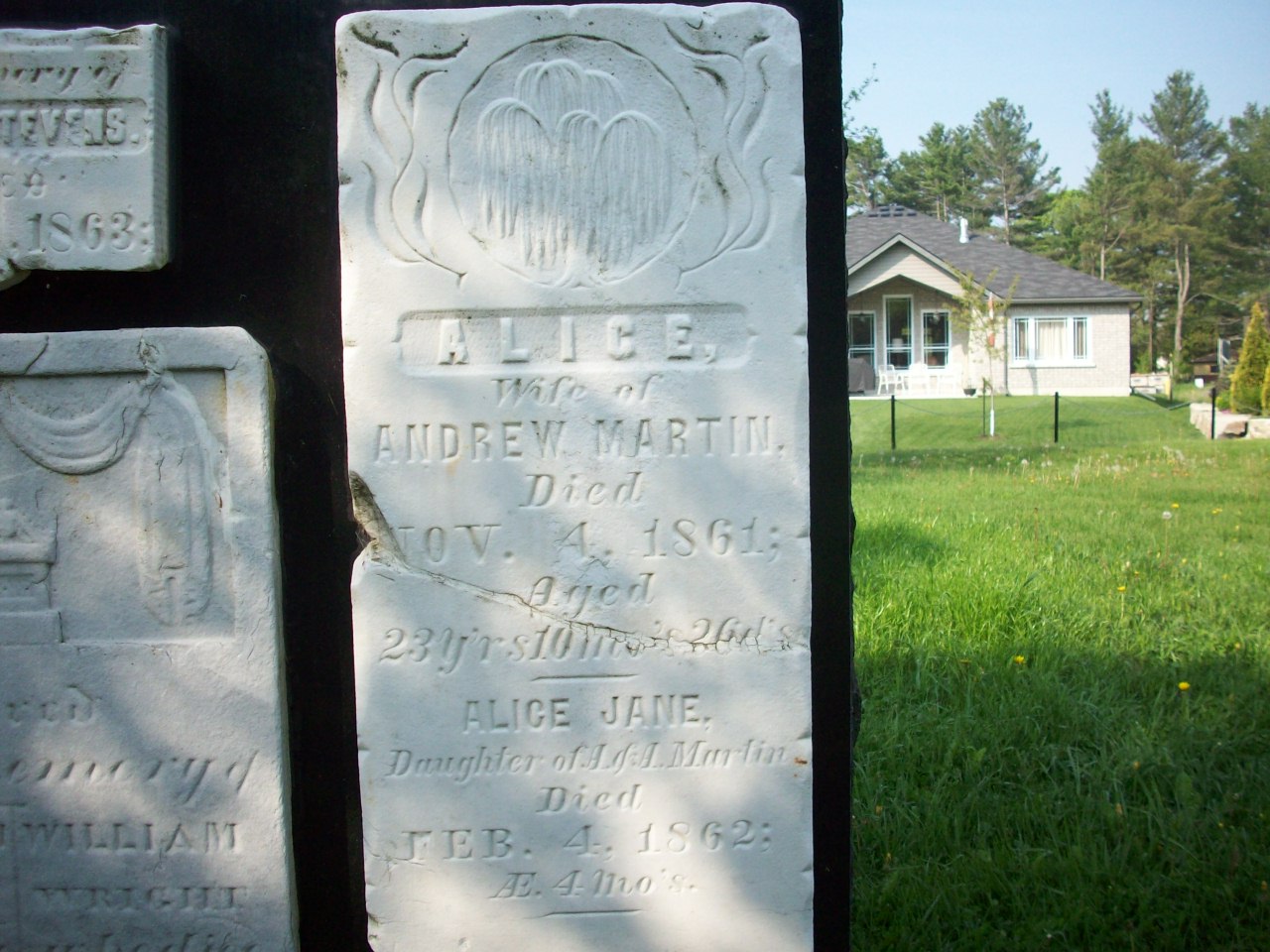 Alice ? was born on 9 December 1837 at Brighton Twp., Northumberland Co., Ontario; Date Dec 9 1837 per Memorial - age 23y 10m 26d at death Nov 4 1861. Date 1838 & location UC per 1861 Census.1,2 As of circa 1858,her married name was Martin.1 She married Andrew Martin, son of Alexander Martin and Eliza Ann Brown, circa 1858 at Northumberland Co., Canada West.1 Alice ? appeared on the census of April 1861 at Brighton, Northumberland Co., Ontario; Age 23 at 1861 Census: see Andrew Martin.1 She died on 4 November 1861 at Brighton, Northumberland Co., Ontario, at age 23; Date Nov 4 1861 per Memorial.1,2 She was buried on 6 November 1861 at Covell Grove Pioneer Cemetery, Gosport, Northumberland Co., Ontario; Memorial: (See Exhibit) Alice; Wife of; Andrew Martin; Died; Nov. 4, 1861; Aged; 23 Yrs. 10 M's 26 D's; Alice Jane; Daughter of A. & A. Martin; Died; Feb. 4, 1862 (Memorial Wall, Covell Grove Pioneer Cemetery, May 23 2011)