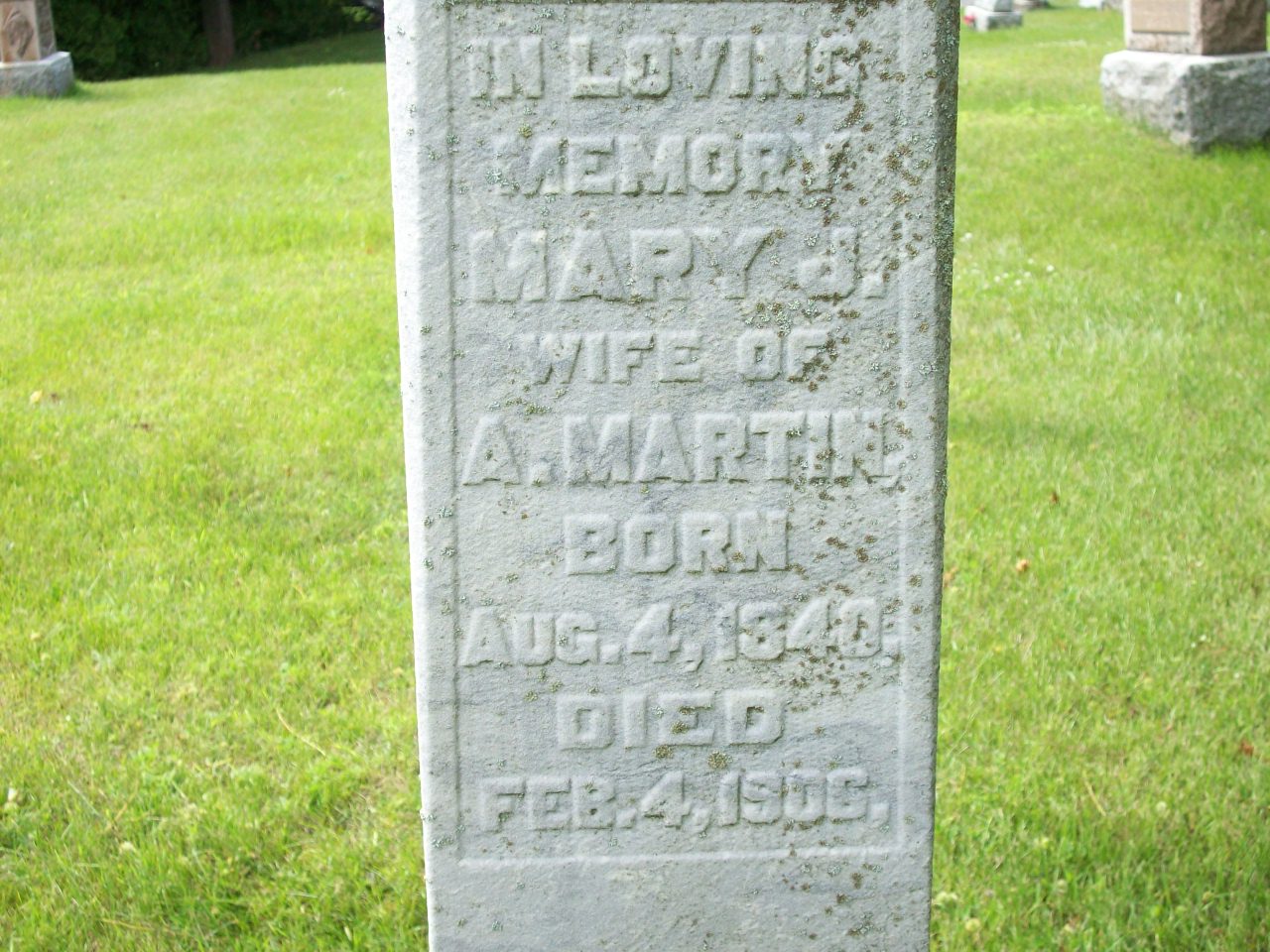 Mary Jane Huldan was born on 4 August 1840 at Murray Twp., Northumberland Co., Upper Canada; Date Aug 4 1840 per Memorial. Date 1841 & location Ont. per 1881 Census. Date 1841 & location Ont. per 1871 Census. Date 1830 & location Murray per marriage register.1,2,3,4 She lived on 16 September 1862 at Murray Twp., Northumberland Co., Canada West; Residence Murray per Marriage Register.1 As of 16 September 1862,her married name was Martin.1 She married Andrew Martin, son of Alexander Martin and Eliza Ann Brown, on 16 September 1862 at Northumberland Co., Canada West; Marriage Register: Groom: Andrew Martin; Age: 37; Res.: Brighton Twp; Born: NY; Parents: Alexander & Eliza Jane Martin; Bride: Mary Jane Huldan; Age: 32; Res. & Born: Murray Twp; Parents: William & Sophia Huldan; Date: Sep 16 1862; Place: Northumberland Co. (Ontario Marriage Register, ancestry.com.)1 Mary Jane Huldan appeared on the census of April 1871 at Brighton, Northumberland Co., Ontario; Age 30 at 1871 Census: see Andrew Martin.5 She appeared on the census of April 1881 at Brighton Twp., Northumberland Co., Ontario; Age 40 at 1881 Census: see Andrew Martin.3 She died on 4 February 1906 at Ontario at age 65; Date Feb 4 1906 per Memorial.4 She was buried on 6 February 1906 at Salem Cemetery, Cramahe Twp., Salem, Northumberland Co., Ontario; Memorial: (See Exhibit) In Loving; Memory; Mary J; Wife of; A. Martin; Born: Aug. 4, 1840; Died; Feb. 4 1906 (Salem Cemetery, Cramahe Twp., Jul 6 2009.)4