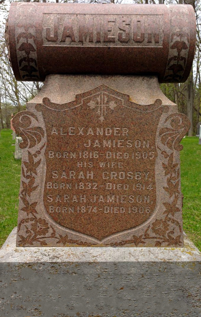 Alexander Jamieson was born on 18 June 1816 at Scotland; Date 1816 per Memorial. Date Jun 18 1817 & location Scotland per 1901 Census. Date 1818 & location Scotland per 1891 Census. Date 1817 & location Scotland per 1871 Census. Date 1818 & location Scotland per marriage register. per marriage reg'n. of dau. Isabell (Jamieson) Anderson.1,3,2,4,5,6 He immigrated in 1855 to Ontario; Immigration 1855 per 1901 Census.4 He lived on 1 April 1863 at Haldimand Twp., Northumberland Co., Ontario; Residence Haldimand Twp. per marriage register.2 He married Sarah Crosby, daughter of Robert Crosby and Isabell ?, on 1 April 1863 at Northumberland Co., Ontario; Marriage Register: Groom: Alexander Jamieson; Age: 45; Res.: Haldimand Twp; Born: Scotland; Parents: John & Alison Jamieson; Bride: Sarah Crosby; Age: 31; Res.: Seymour Twp; Born: Northumberland Co; Parents: Robert & - ; Date: Apr 1 1863; Place: Northumberland Co. (Ontario Marriage Register, ancestry.com) per marriage reg'n. of dau. Isabell (Jamieson) Anderson.1,2 Alexander Jamieson appeared on the census of April 1871 at Haldimand Twp., Northumberland West Co., Ontario; Age 54 at 1871 Census: Jamieson, Alexander, 54, b. Scotland, Scot., C. Pres., farmer, married; Sarah, 39, b. Scotland, Scot., C. Pres., married; Isabell, 3, b. Ont., Scot., C. Pres; Aleson, 5/12 - Oct. (1871 Census: Haldimand Twp., Northumberland West Co., dist. 54, sub-dist. C-2, pg. 73, line 2 - ancestry.com.)6 He appeared on the census of 7 April 1891 at Haldimand Twp., Northumberland West Co., Ontario; Age 73 at 1891 Census: Jamieson, Alexander, 73, b. Scotland, p.b. Scotland, Pres., farmer, married; Sarah, 58, b. England, p.b. England, Pres., married; Isabel, 22, b. Ont., p.b. Scotland & England, Pres., daughter, single; Alison, 20, b. Ont., p.b. Scotland & England, daughter, single; Sarah, 16 (1891 Census: Haldimand Twp., Northumberland West Co., dist. 99, sub-dist. C-1, pg. 2, line 1 - ancestry.com.)5 He appeared on the census of 3 April 1901 at Haldimand Twp., Northumberland West Co., Ontario; Age 83 at 1901 Census: Jamieson, Alex, 83, b. Scotland Jun 18 1817, immig. 1855, Scot., Pres., farmer, married; Sarah, 65, b. England Feb 7 1836, immig. 1855, Eng., Pres., married; Isabell, 33, b. Ont. r. Nov 3 1867, Scot., Pres., daughter, single; Sarah, 27?, b. Ont. r. 17 ?? 1873, SCot., Pres., daughter, single (1901 Census: Haldimand Twp., Northumberland West Co., dist. 96, sub-dist. c-2, pg. 1, line 33 - ancestry.com.)4 He was buried in 1905 at St. Andrew's Unkited Church, Grafton, Northumberland Co., Ontario; Memorial: (see exhibit) JAMIESON; Alexander; Jamieson; Born 1816 - Died 1905; His Wife; Sarah Crosby; Born 1832 - Died 1914; Sarah Jamieson; Born 1874 - Died 1906 (St. Andrew's United Church Cemetery, Grafton - image sent to me via email by barbra Lang Walker, Dec 5 2016.)3,7 He died in 1905; Date 1905 per Memorial.3