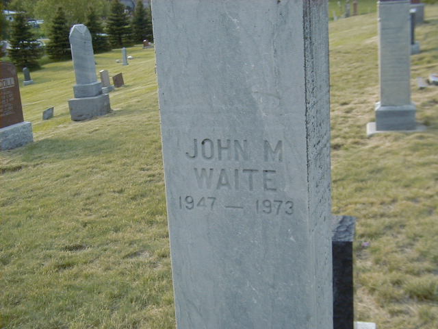 CEMSearch: Name: John M. Waite; Born: 1947; Died: 1973; Buried: McPhail's Cemetery, Brighton Twp; Other names: ? Waite (1922-1922), Bertha G. Grosjean (Waite)(1919-1996), Byron Waite ( -1927), Francis C. Grosjean (1912-1977), Malcolm M. Waite (1875-1958), Ruth Waite (Mccoll)(1875-1911), Violet M. Waite (Perry)(1888-1962.)2,1 He died in 1973; Date 1973 per Memorial & CEMSearch.1,2