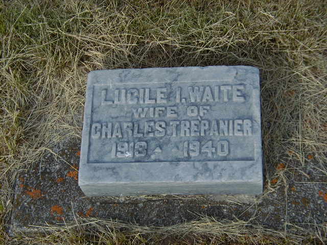 Lucile I. Waite was born in 1913 at Ontario; Date 1913 per Memorial.1 As of circa 1935,her married name was Trepanier.1 She married Charles Trepanier circa 1935; per Memorial of Lucile I. Waite.1 Lucile I. Waite was buried in 1940 at McPhail's Cemetery, Brighton Twp., Northumberland Co., Ontario; Memorial: (See Exhibit) Lucile I. Waite; Wife of; Charles Trepanier; 1913 - 1940 (McPhail's Cemetery, Brighton Twp., May 21 2004.)1 She died in 1940 at Ontario; Date 1940 per Memorial.1